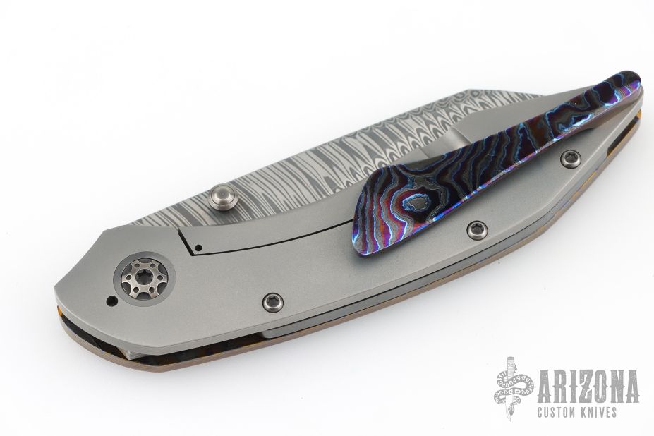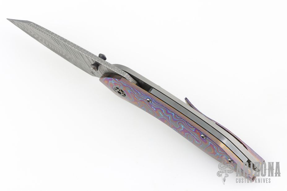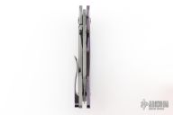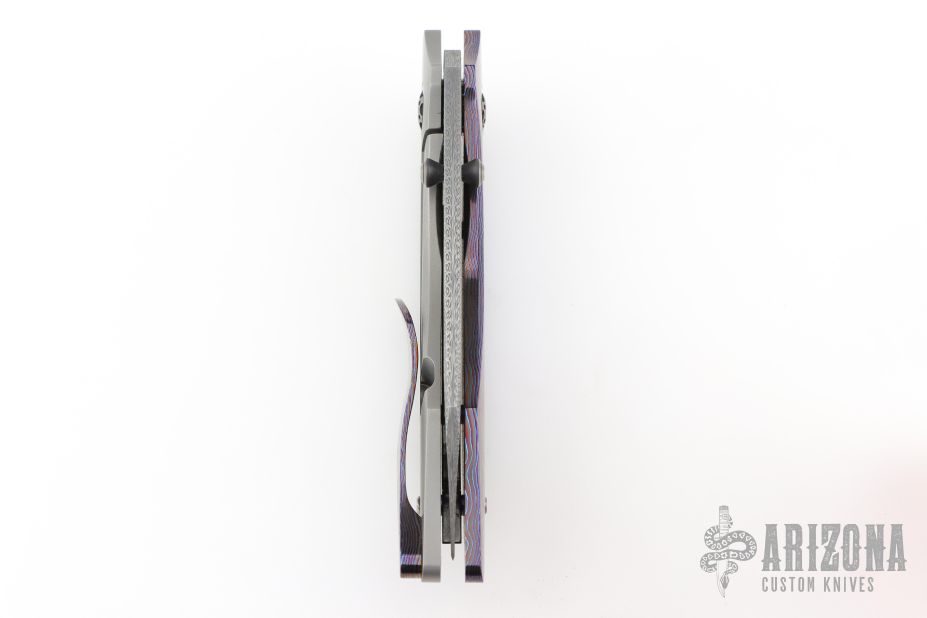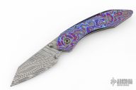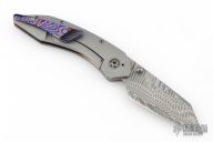 This K9 by Keanison Knives features a Fafnir Damasteel blade with dual titanium thumb studs. The handle has a ZircuTi and bead blasted titanium frame, zirconium backspacer, zircuti tip up pocket clip with hidden screws, zirconium pivot collars.  Includes original hard case and COA Dogtag. Excellent condition.