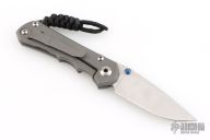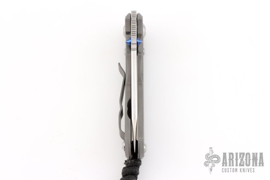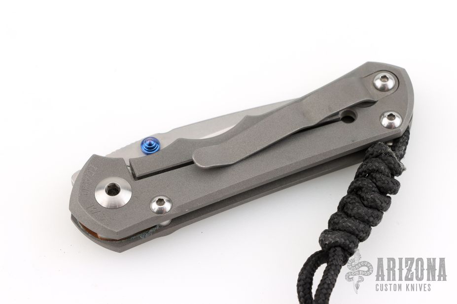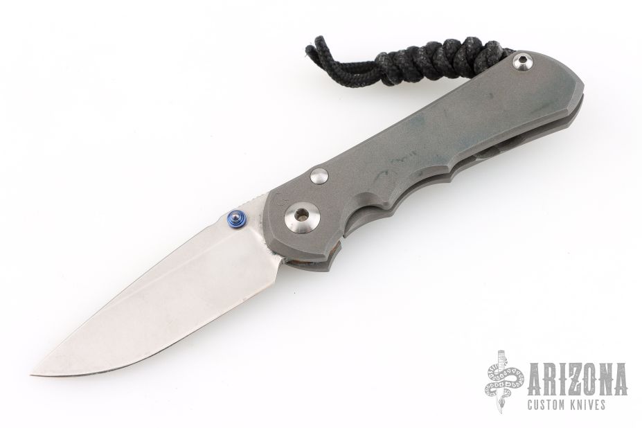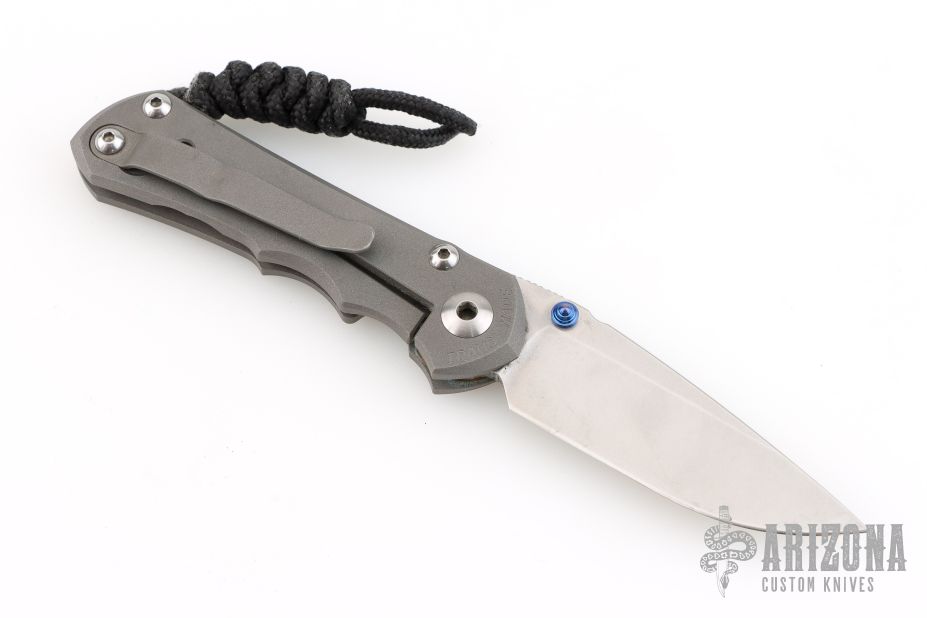 This Small Inkosi from Chris Reeve Knives features a tumble finished drop point blade with dual anodized thumb studs and notched thumbrest. The handle has a bead blasted titanium frame over a single barrel spacer with a matching bead blasted titanium tip up clip. Includes original box, tool, and COA dated July 28, 2016. Has some scuffs and scratches, great overall condition otherwise.