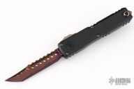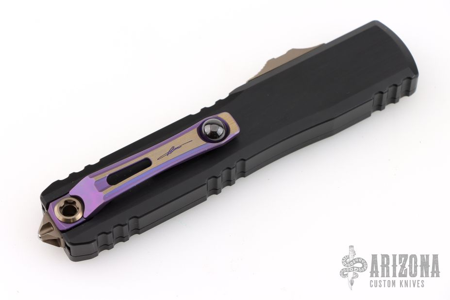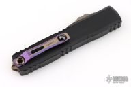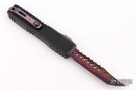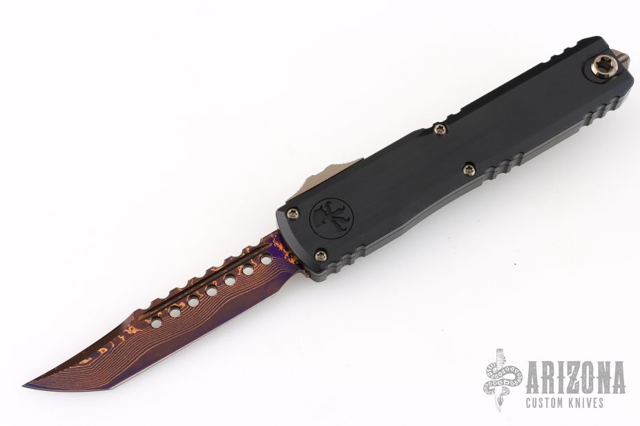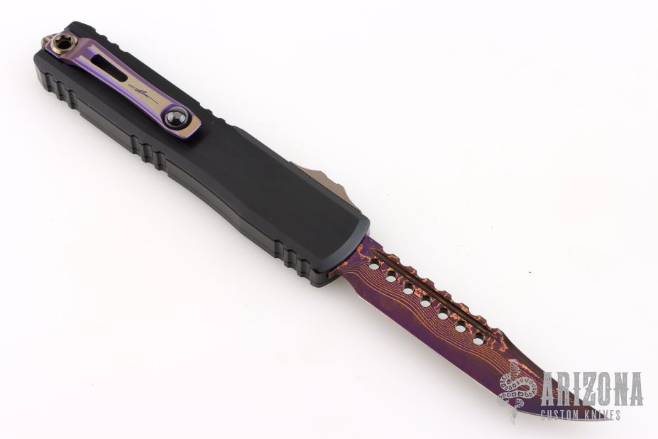 This Ultratech Gen III by Microtech features a blued Baker Forge Coppermai Damascus Hellhound blade with notched thumbrest and false top edge. The handle has a hefted black alloy frame with bronzed hard cut hardware and purple titanium accents. Comes with original box and COA dated 6/2025. Excellent condition.