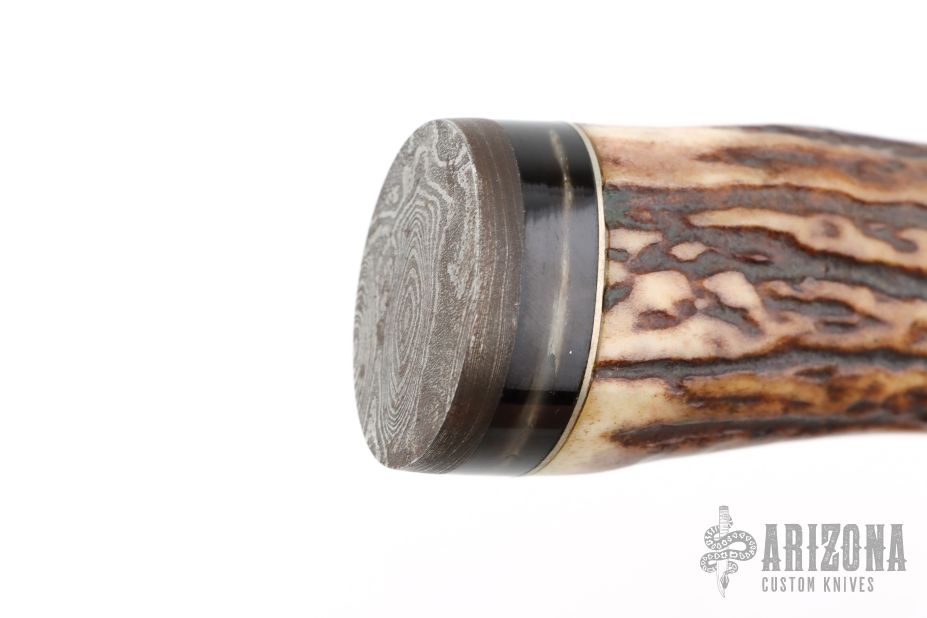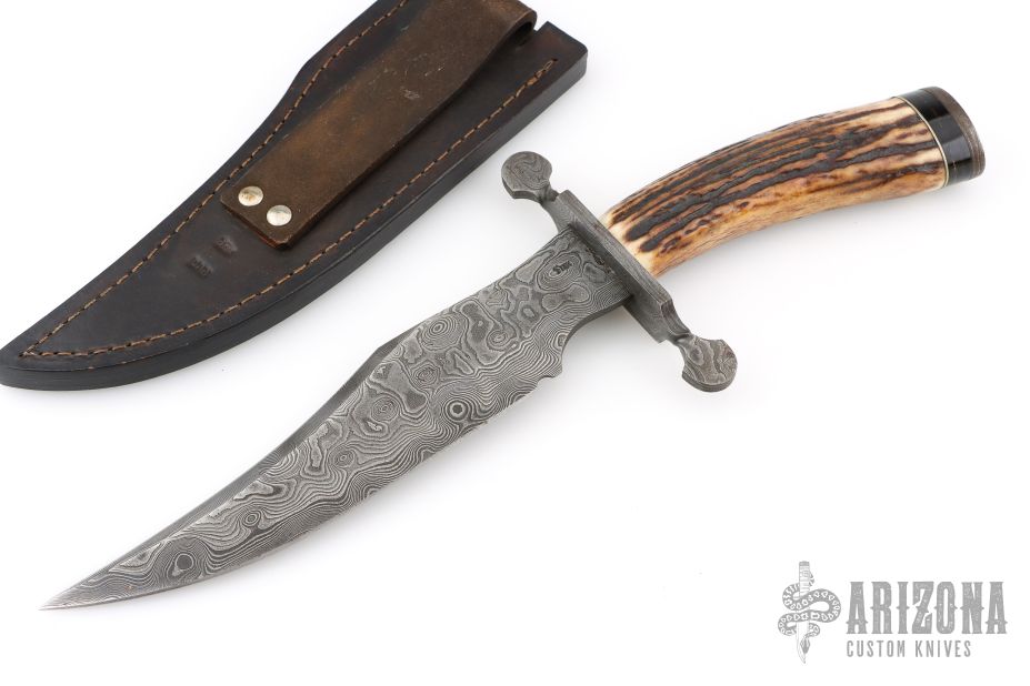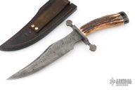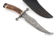 This Bowie from Stek Knives features a Damascus blade with sharpened top edge, .263" blade stock and 1.835" blade depth, hidden tang construction. The handle has a Damascus guard, premium Sambar Stag grip, Damascus pommel with silver and horn spacer. Comes with leather belt sheath, Certificate of Origin, and a photobook with pictures documenting the creation process. Has a light patina, excellent condition.