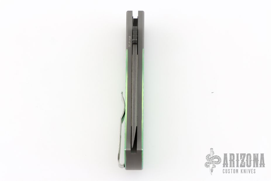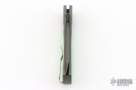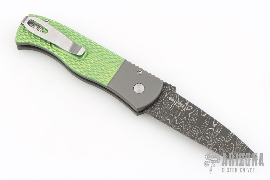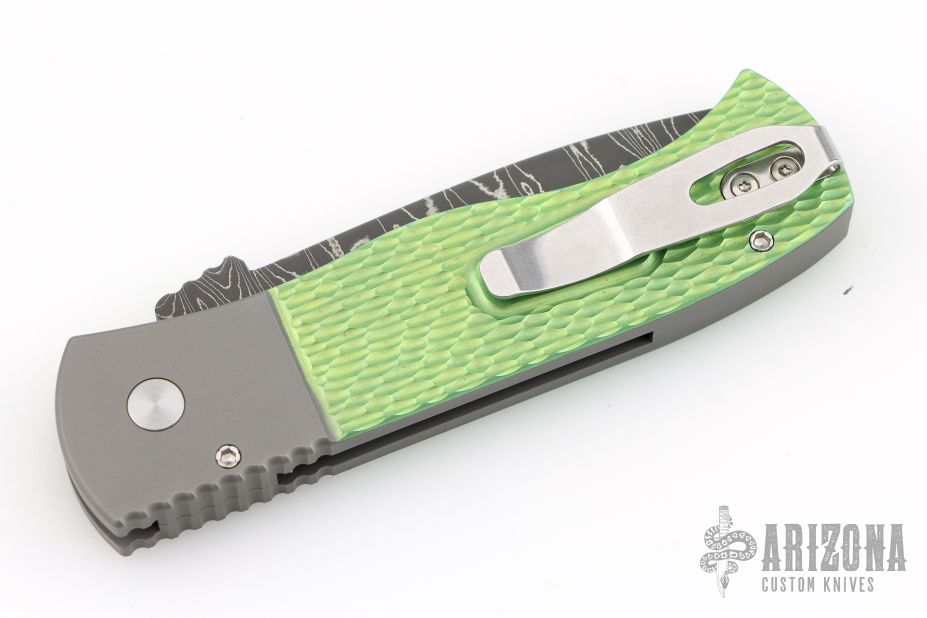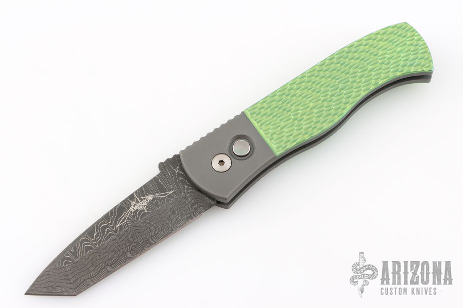 This Emerson/Pro-Tech CQC7 automatic has a chisel ground Chad Nichols Damascus tanto blade with notched thumbrest. The handle has a a two-tone anodized and textured titanium frame with black lip pearl inlaid push button. Stainless steel clip, tip up carry. Coil spring. Comes with original box and papers. Excellent condition.