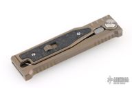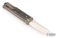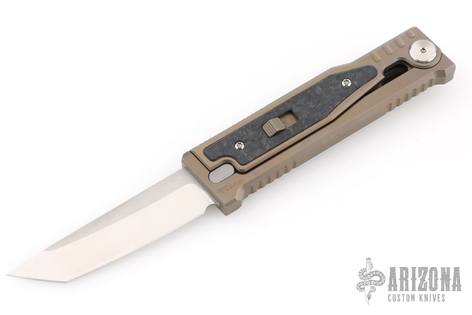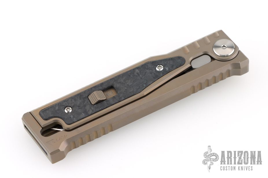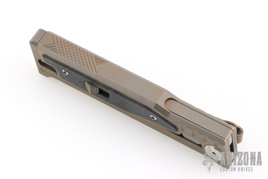 EXO-M Gravity knife. Tanto blade, bronze anodized titanium handle, marble carbon fiber inlays. Comes with original box, and accessories. S/N 021 dated 07/2023. Includes the original box and papers. Excellent Condition.