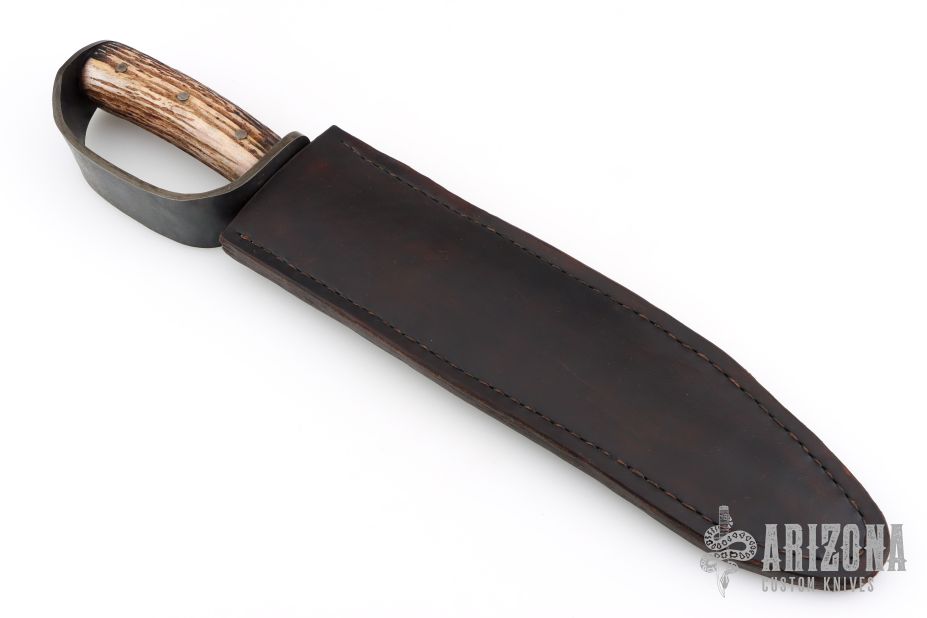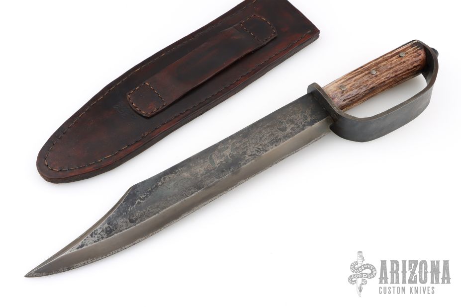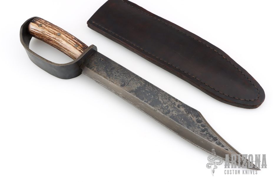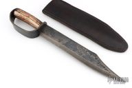 This D-Guard Bowie from ML Knives features a forge finished blade with a sharpened top edge, .257" blade stock, 2.047" blade depth, hidden tang construction. The handle has a forged steel D-guard and a stag grip with steel pins. Comes with a black leather sheath. Excellent condition.