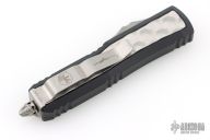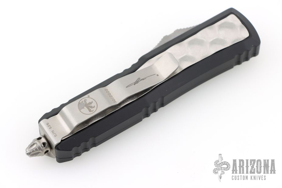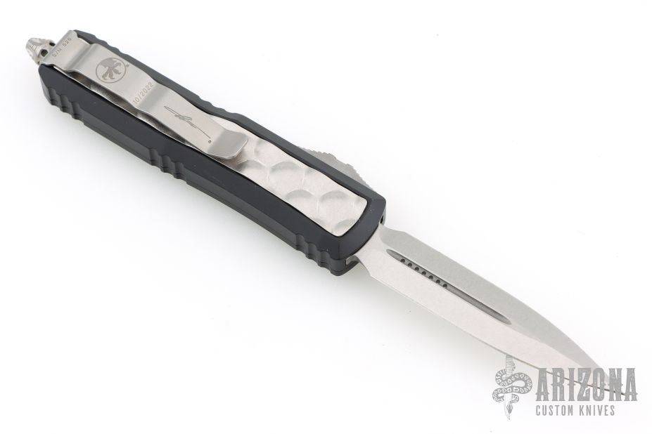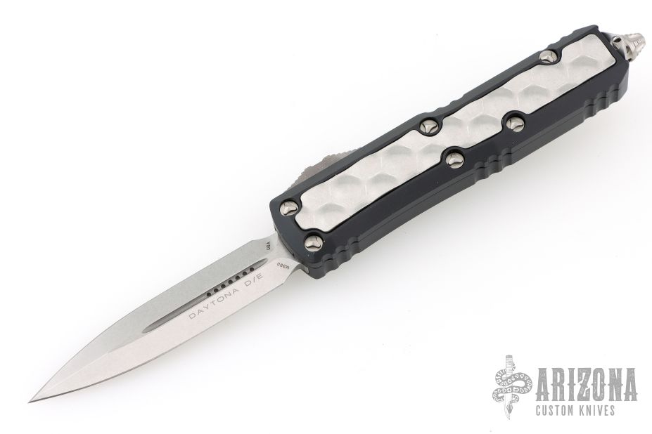 This Daytona OTF automatic features a D/E stonewashed dagger style blade with standard edges and bubble inlays in the black aluminum handle. Tip down tumbled stainless clip and hardware. Serial number 525 and dated 10/2022. Has some scuffs and scratches, great condition otherwise.