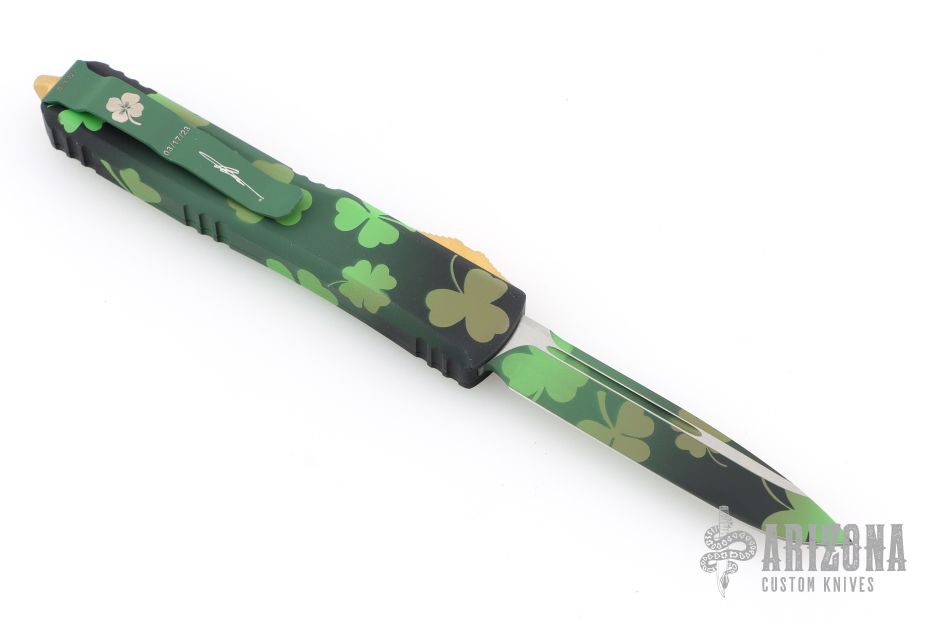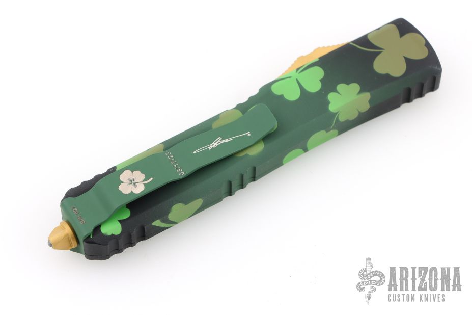This Ultratech OTF automatic by Microtech features a S/E green blade. Green aluminum contoured frame with tip down stainless steel clip. Dated 03/17/23. S/N 027. Comes with original box, signed in gold marker. Excellent Condition.