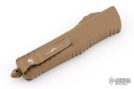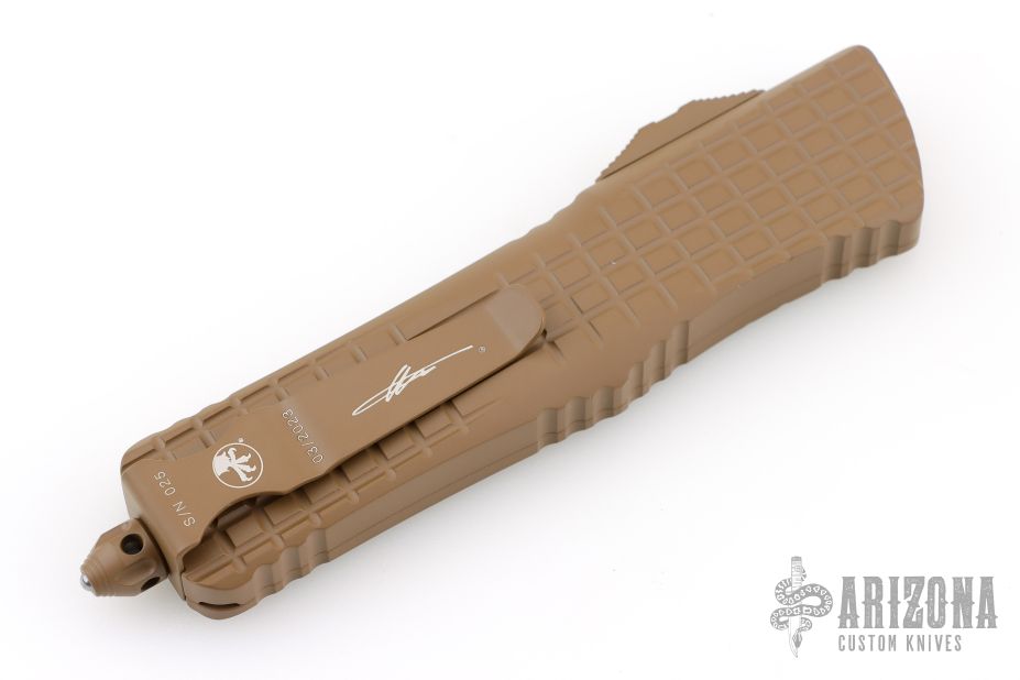 The Combat Troodon is a precision-made, out-the-front tactical knife. It is 25% larger than the flagship, the Troodon. It brings the slender handle, contoured shape, radical design elements, and a sophisticated internal mechanism that improves operational functionality and reliability to a larger scale. The Combat Troodon is designed for a broad spectrum of utility and close quarter combat applications. Has a fluted Tan Cerakote tanto blade. Tan Cerakote fluted/frag pattern aluminum handle with black hardware, tip down stainless steel clip and nickel boron internals. Comes with original box and papers. Excellent condition. Dated 03/2023 and S/N 025.