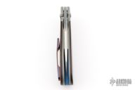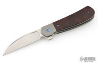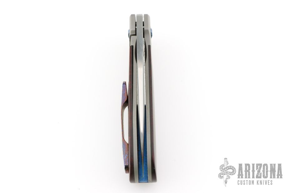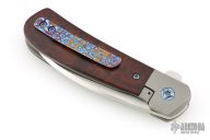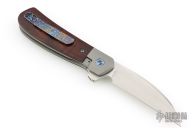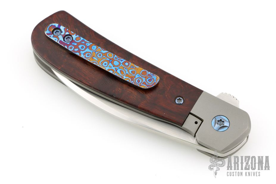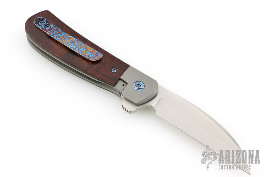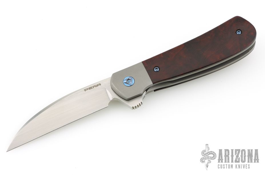 This Swayback flipper from Enrique Pena features a hand rub satin finished wharncliffe blade with notched flipper. The handle has a bead blasted titanium frame with desert ironwood burl scales, anodized titanium hardware and backspacer, and a tip mokuti clip. This knife flips well with no wrist action needed. Blade is centered when closed and locks up with no blade play. Comes in an embroidered/padded case. Has some light scuffs/scratches, otherwise excellent condition.