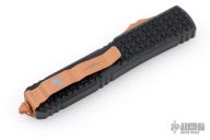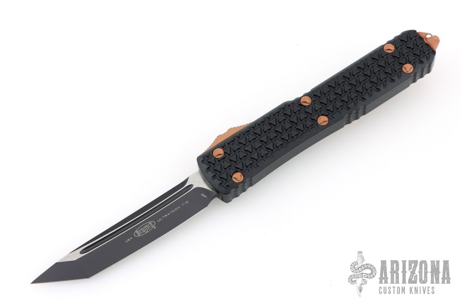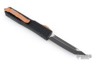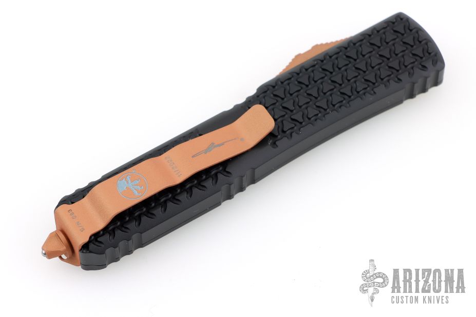 This Ultratech OTF automatic by Microtech features a T/E blade with a standard edge. Copper button, hardware, and clip. Glass breaker. Black TriGrip aluminum handle with glass breaker. Dated 11/2022 and serial number 063. Excellent condition. Comes with original box and papers.