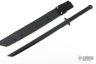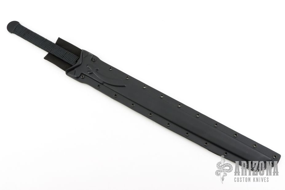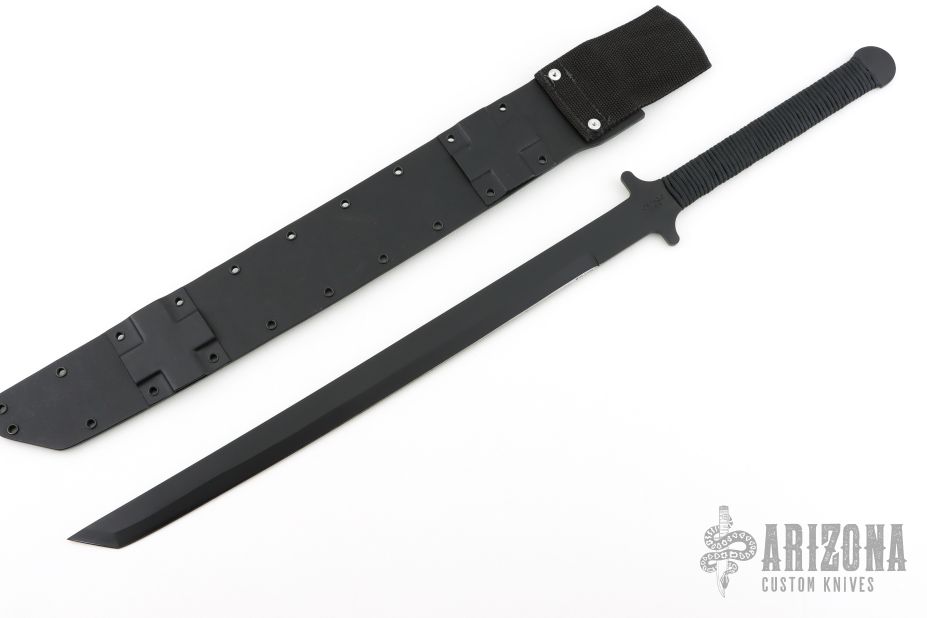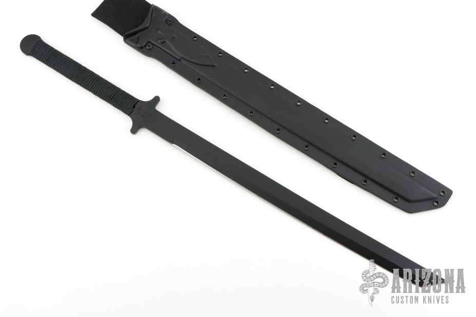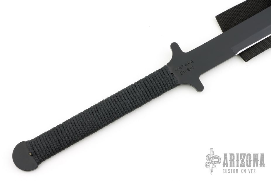 This BWS-1 Katana by Ontario USA features a black blade with .192" blade stock and 1.318" blade depth, full tang construction with cord wrapped grip. Comes with original Kydex sheath. Excellent condition.