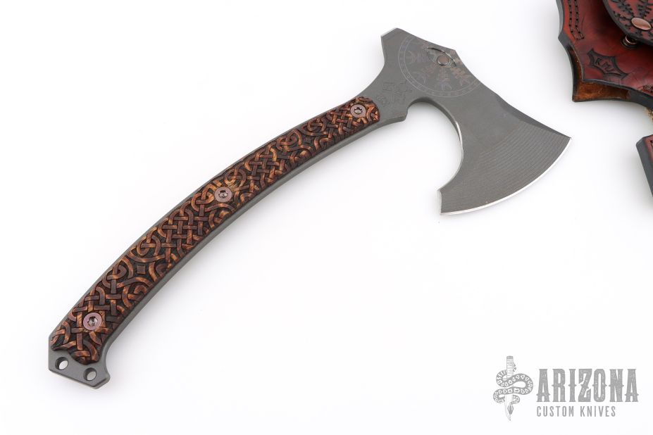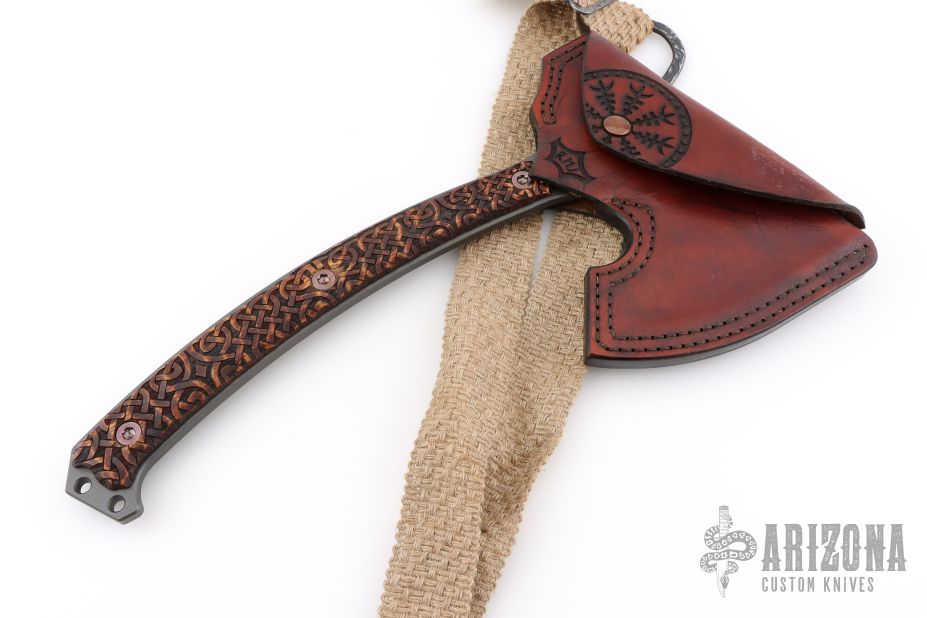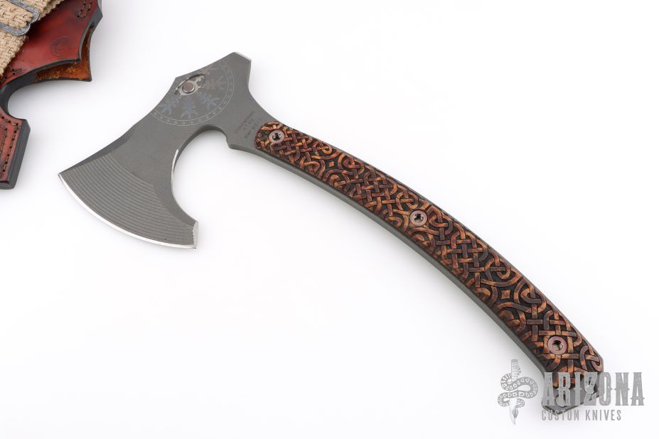 Custom RMJ Gold Point Berserker - 4140 Steel, marked Sep 2017. The handle is Celtic Knot Work pattern charred hickory scales, the blade has been laser engraved, and the beard of the axe, as well as the poll have been sharpened. Comes in a custom leather sheath with laser engraving, basketweave burlap strap, and custom forged stainless sliders/rings forged with the catacombs pattern. Limited release, and hard to find. Has a couple light scuffs, excellent condition otherwise.