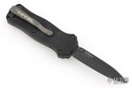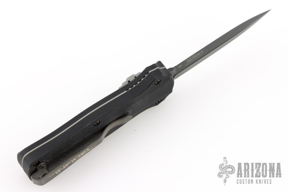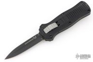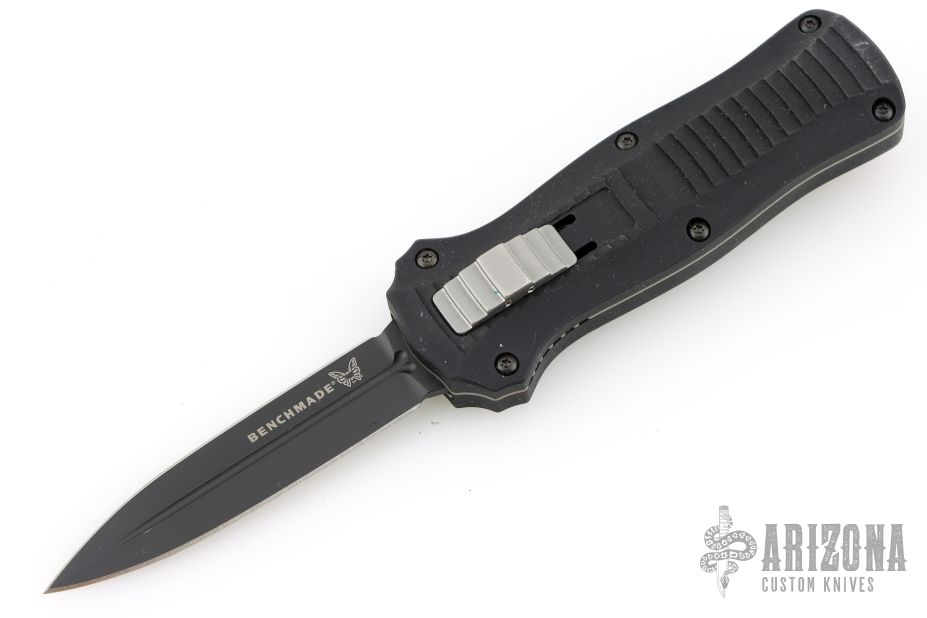 This 3350 Mini-Infidel by Benchmade features a black double edge dagger style D2 blade with fullers. The handle has a black anodized aluminum frame, ramped steel thumb slide and steel tip down clip. Comes with original box, sheath and papers. Has scuffs and scratches, great condition otherwise.