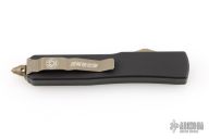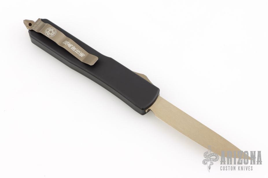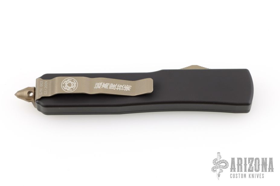 This Katana Ultratech OTF automatic features a bronzed etched tanto plain edge blade. Chisel grind. Bronze colored anodized fittings. Glass breaker. Numbered S/N 003 and dated 02/2009. Comes with original box, papers, nylon belt sheath, and drawstring pouch. Excellent condition.