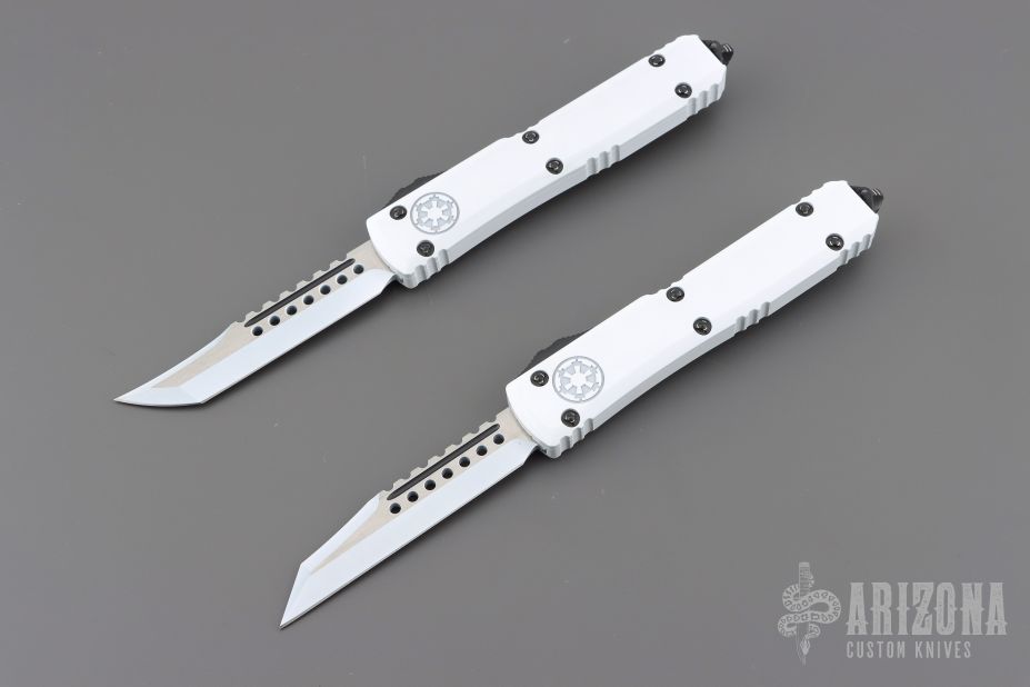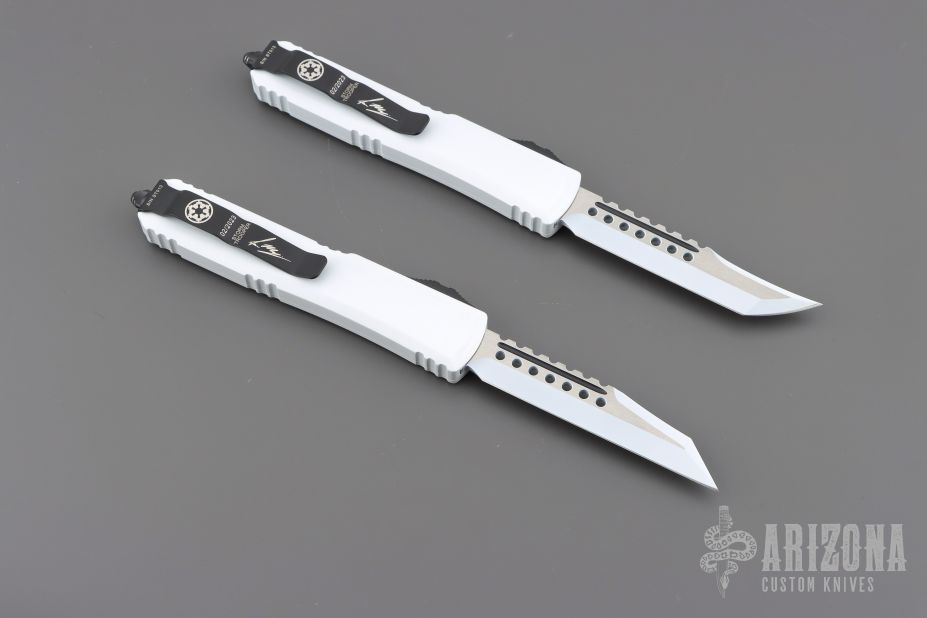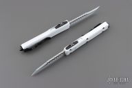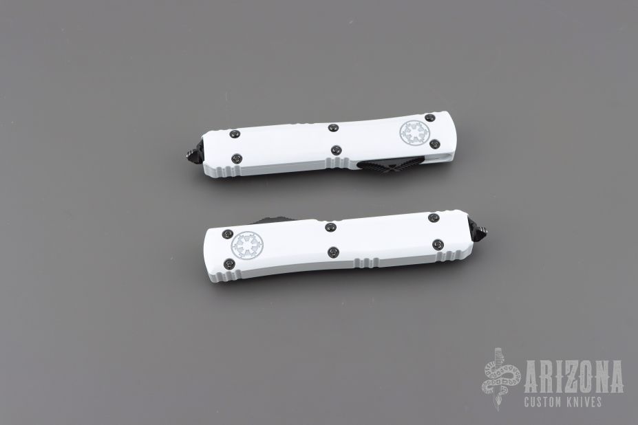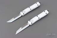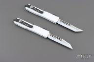 These two Ultratech OTF automatics by Microtech both feature white cerakote blades. Storm Trooper aluminum contoured frame with black ringed hardware and tip down stainless steel clip.  One knife has a Hellhound blade and one knife has a Warhound blade.  Includes original box and papers. S/N 013. Excellent condition.