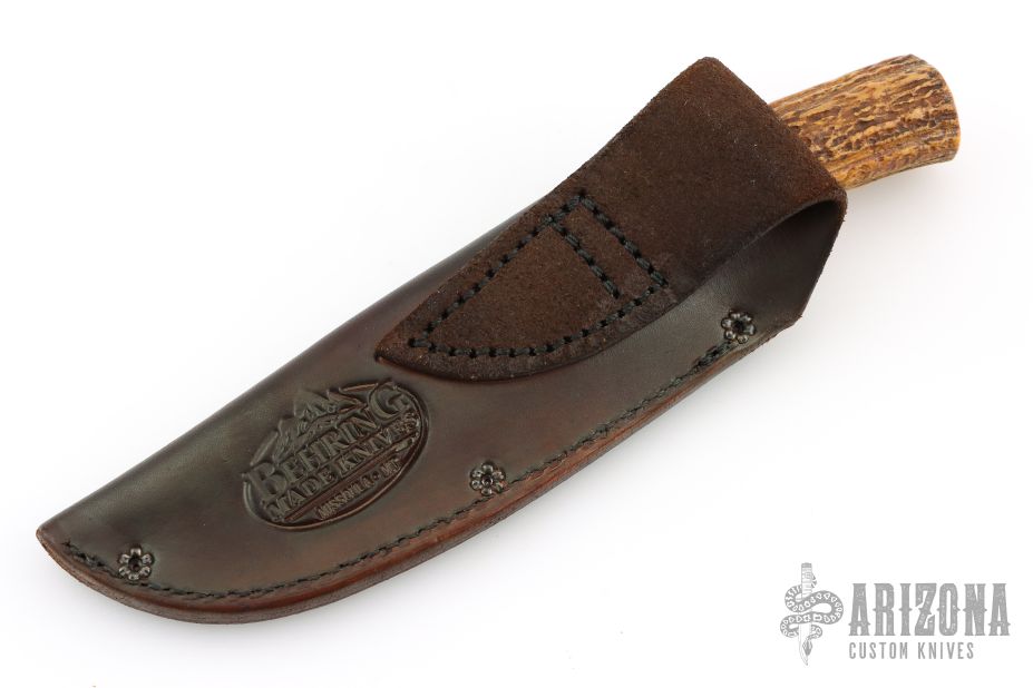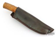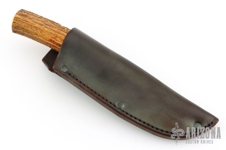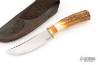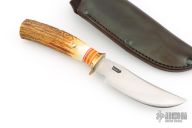 This Skinner by Rocco Handmade features a satin finished convex ground blade with .151" blade stock and 1.177" blade depth, hidden tang construction. The handle features a brass guard, aluminum/red/white/yellow spacer pattern, stag grip with brass pin. Great look and feel. Comes with abrown leather sheath. Has a few light sheath marks, otherwise excellent condition.