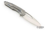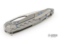This Collaboration by Deryk Munroe and Anthony Marfione features a satin finished blade, thumb hole and flipper, notched thumbrest. The handle has a bead blasted titanium frame with a titanium lockbar and tip up retractable clip, titanium backspacer, Damascus overtravel stop, stainless lockface insert. Comes with original box, zippered case and papers. Marked Anthony Marfione and Deryk Munroe and dated 11/2015. Excellent condition.