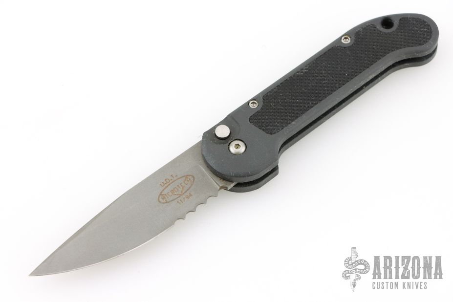 This UDT auto by Microtech Knives features a spear point bead blast blade with partial serrations. The handle has a black aluminum frame with non-slip inserts and a lanyard. Comes with original gold box. Dated 11/94. This is one of the first UDT's made by Anthony Marfione before he had a shop. Very Rare Piece. Has a couple light scuffs, otherwise Excellent condition.