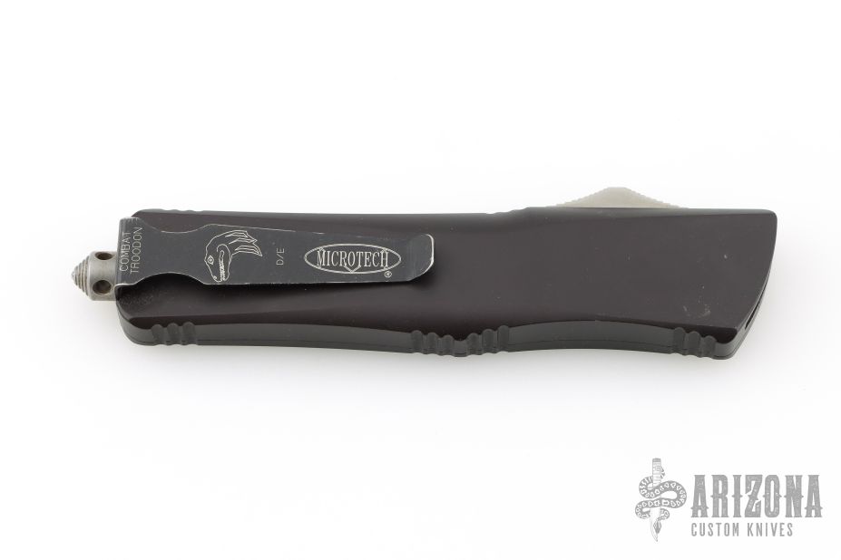This Combat Troodon OTF automatic features a bead blast D/E partially serrated double edge blade. Black coated stainless steel clip. Glass breaker. Serial number 02127 and dated 02/2009. Has some light scuffs and scratches, great overall condition.