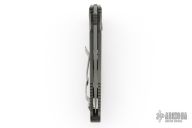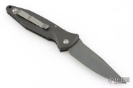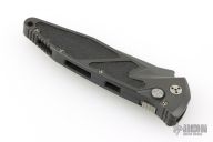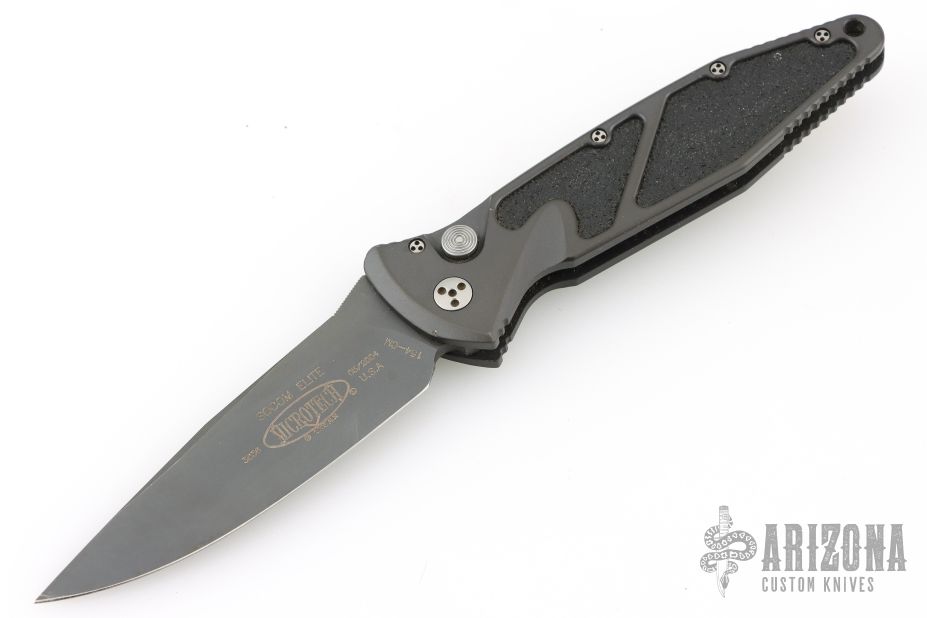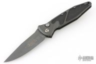 This Mini Socom Elite automatic folder by Microtech Knives has a black blade with a notched thumb ramp. The handle is comprised of black aluminum with non-slip inlays, stainless steel clip positioned for tip up carry, and lanyard hole at the pommel. Has some scuffs and scratches, great overall condition. Has safety.