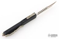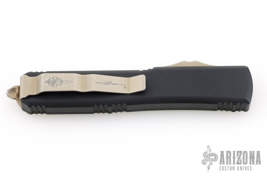 This Ultratech Hellhound by Microtech Knives features a bonzed apocalyptic finished blade with notched thumbrest and fullers, false top edge. The handle has a black aluminum frame with black G-10 top, with tip down bronzed stainless steel clip and hardware. Comes with original box and papers. Excellent condition. Dated 09/2018.
