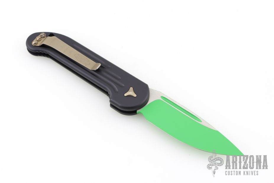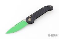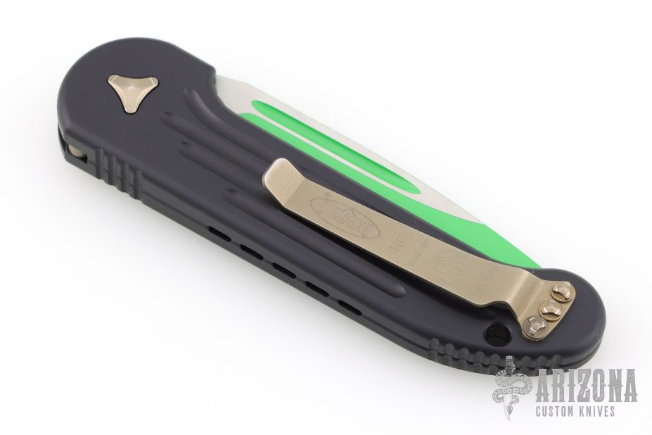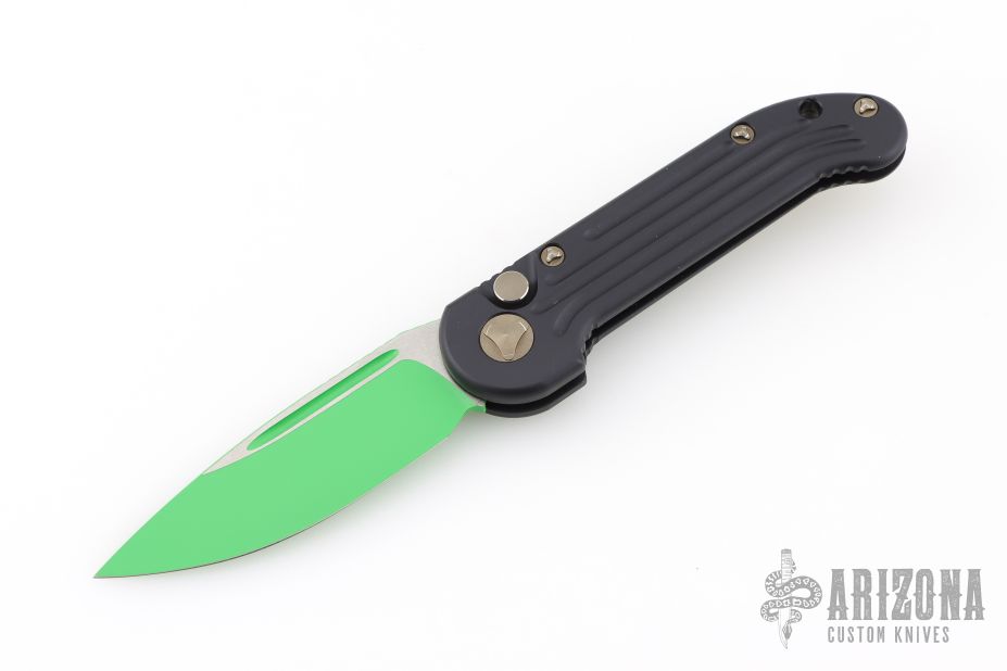 This Jedi Master LUDT auto by Microtech Knives has a green blade with a standard edge and a black aluminum frame. Stainless steel clip. Dated 06/2016 and serial number 198. Comes with the wrong MT box and papers. Has some light scuffs, excellent condition otherwise.