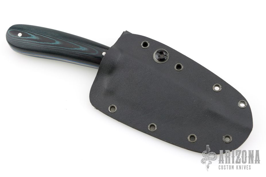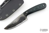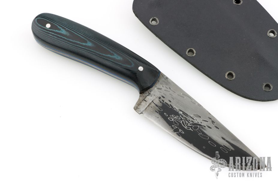 This Hunter by Mark Cucina features a Fish Hook Damascus blade with a full tapered tang construction, .130" blade stock and 1.255" blade depth. The handle has black/blue linen micarta scales. Includes a kydex sheath. New from maker.