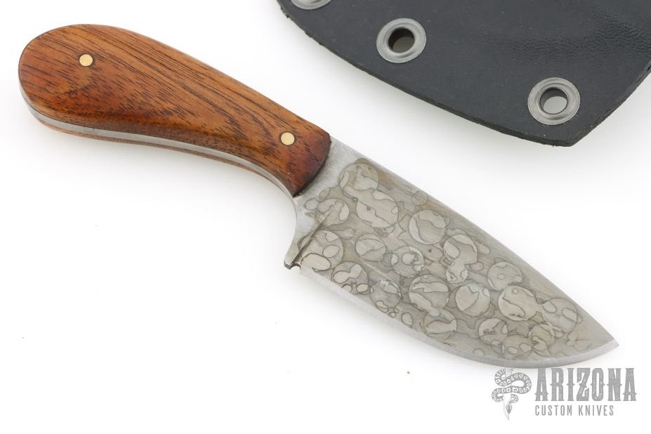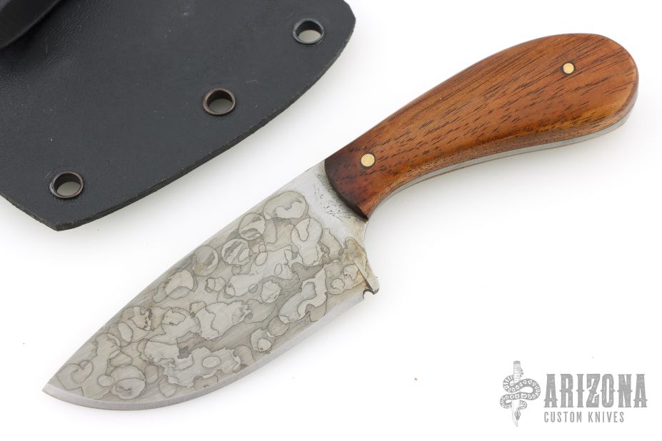 This Skinner by Mark Cucina features a hand rub satin finished blade with mustard patina, full tang construction, .127" blade stock and 1.324" blade depth. The handle has ironwood scales. Includes a kydex sheath. New from maker.