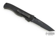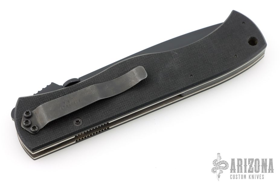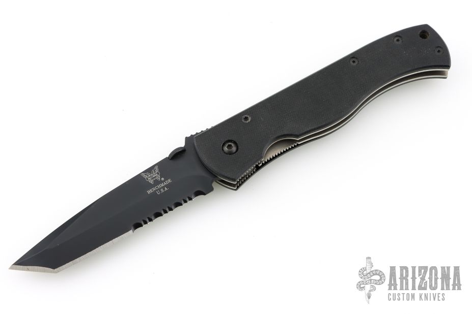 This knife is the Benchmade version of an Emerson CQC7. This knife has a chisel ground black partially serrated blade with thumb disc and notched thumbrest. The handle has black G-10 scales, titanium liners and a tip down black stainless steel clip. Excellent condition. Comes with a nylon belt sheath.
