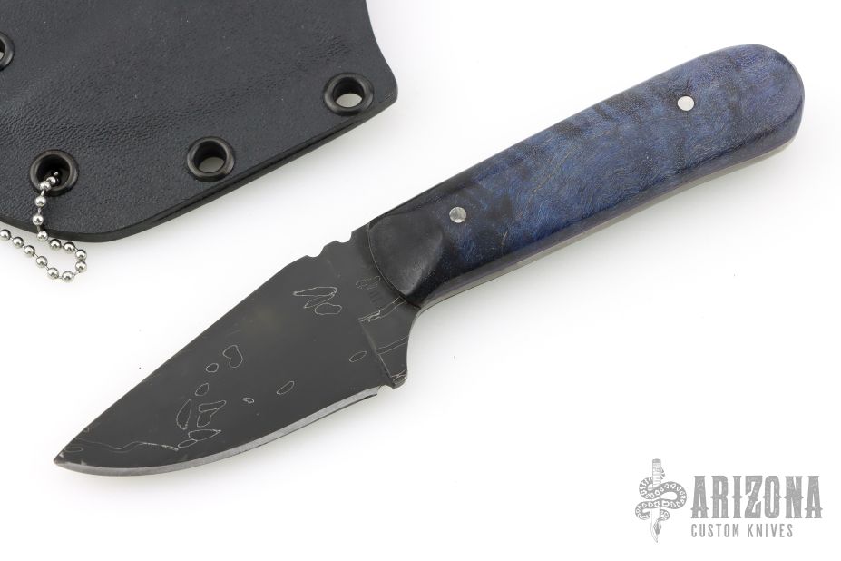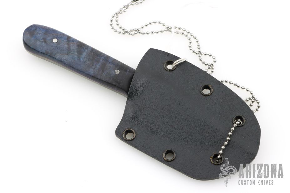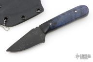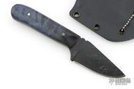 This Hunter by Mark Cucina features a Fish Hook Damascus blade with a coffee etch, full tang construction, .139" blade stock and 1.202" blade depth. The handle has purple dyed quilted maple scales. Includes a kydex sheath with ball chain. New from maker.