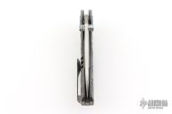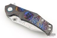 This Framelock Flipper by SixLeaf features a polished Damascus blade with dual thumbstuds, notched thumbrest and flipper tab. The handle has a bead blasted, carved, and anodized titanium frame with tip up clip, titanium backspacer with lanyard hole. Reversible clip. Comes in a plastic clasped case. Has some light scuffs and scratches, great overall condition.