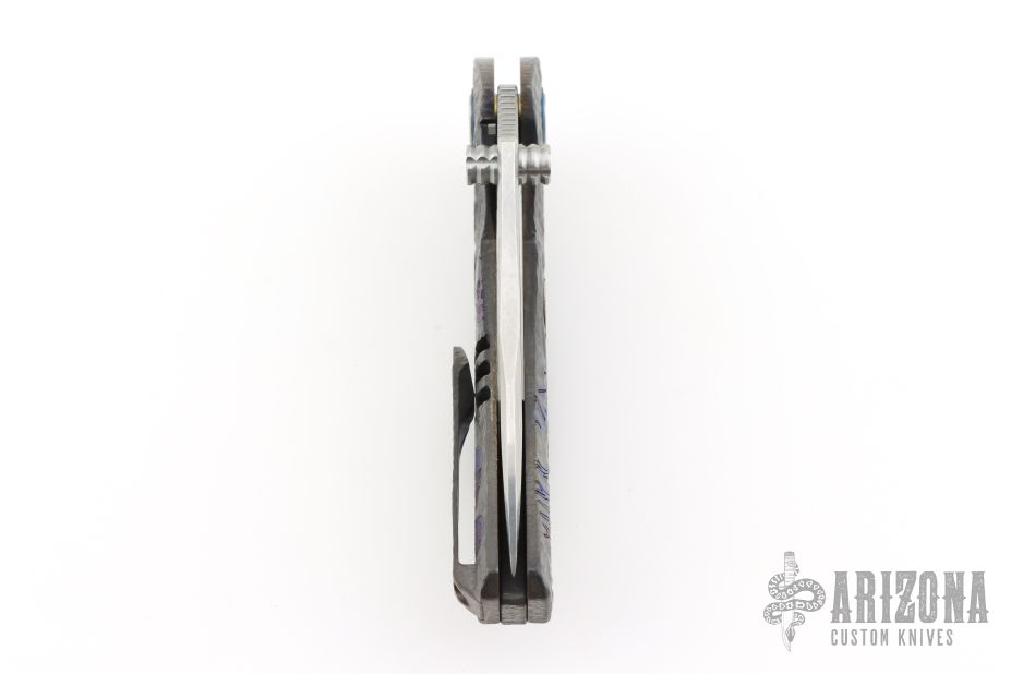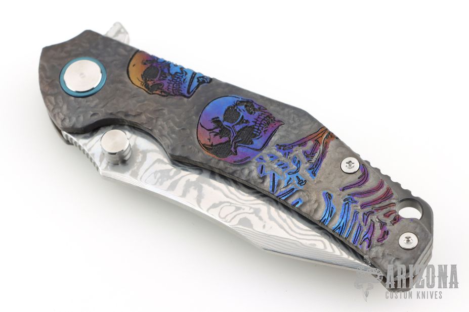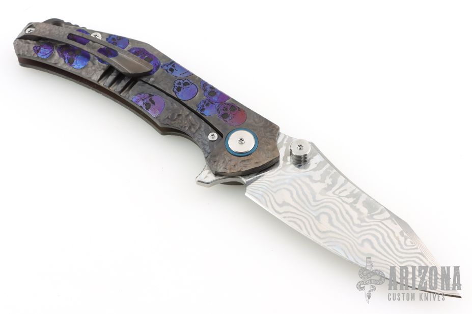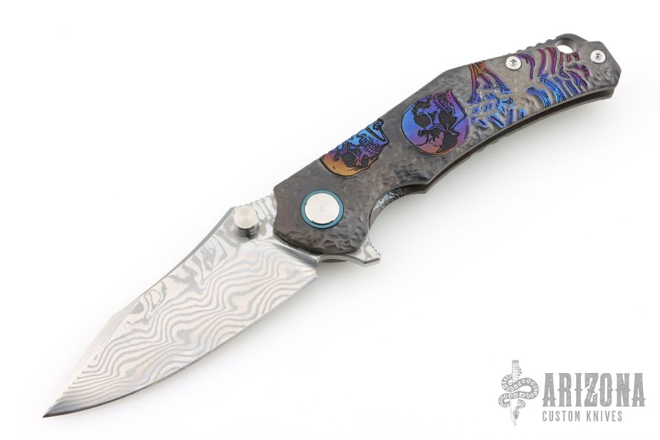 This Framelock Flipper by SixLeaf features a polished Damascus blade with dual thumbstuds, notched thumbrest and flipper tab. The handle has a bead blasted, carved, and anodized titanium frame with tip up clip, titanium backspacer with lanyard hole. Reversible clip. Comes in a plastic clasped case. Has some light scuffs and scratches, great overall condition.