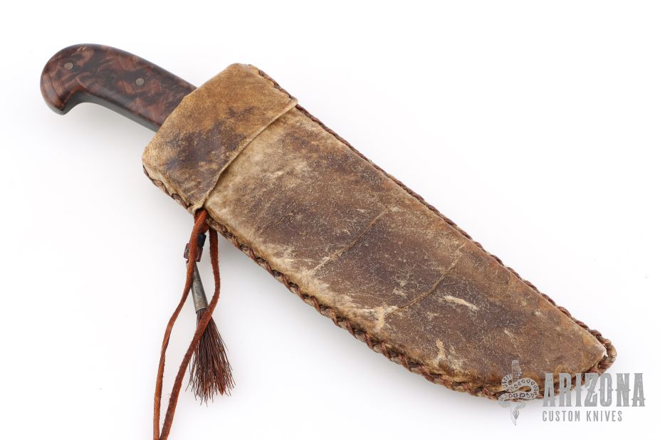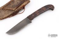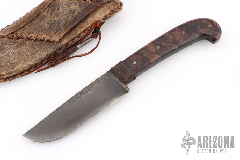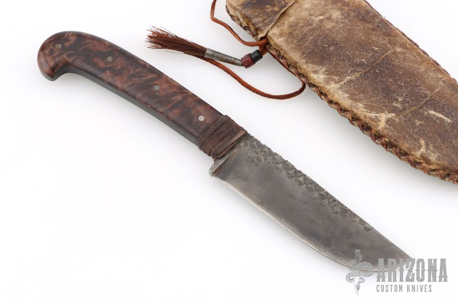 This Birds Beak Hunter by Master Smith Daniel Winkler features a hand forged blade with a fileworked thumbrest and full tapered tang construction, .179" Blade Stock and 1.235" Blade Depth.  The handle has a leather wrapped guard, curly maple scales with steel pins.  Includes a raw hide leather sheath. Excellent condition.