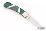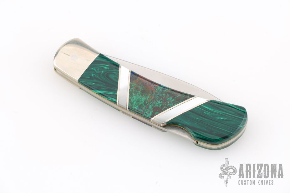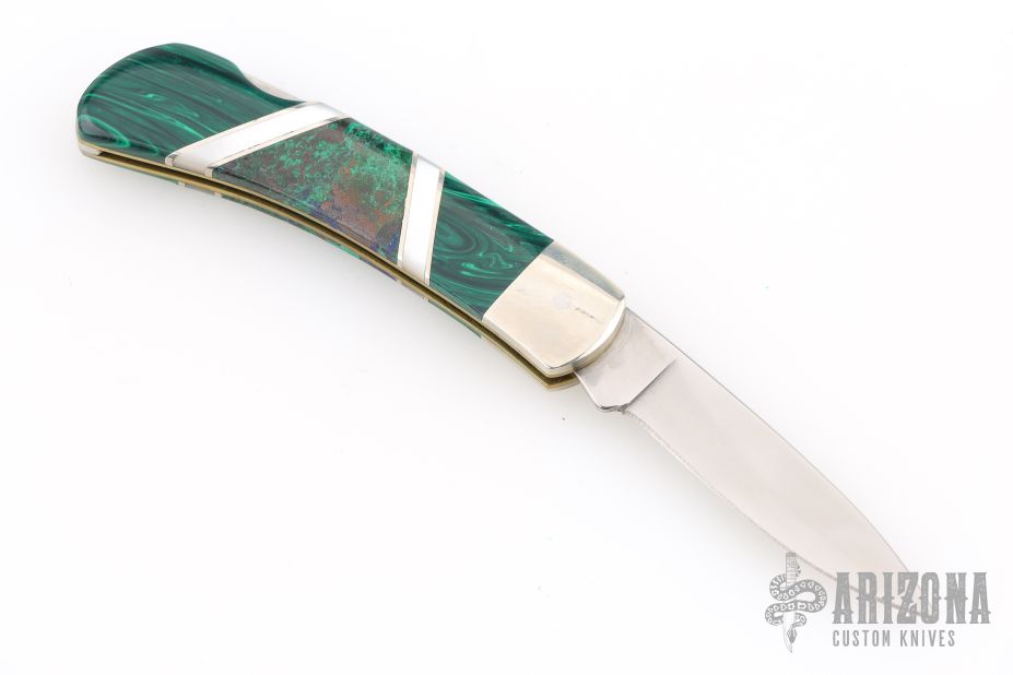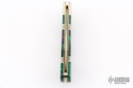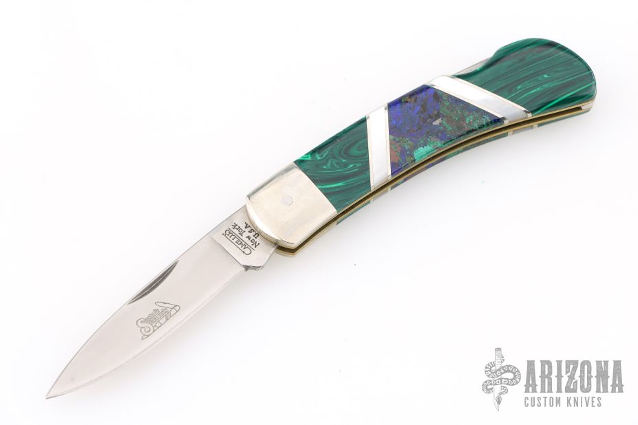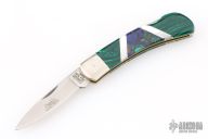 This Lockback by Camillus Knives was customized by Santa Fe Stoneworks. It features a satin finished blade with nail nick. The handle has nickel silver bolsters, stone inlays, pearl and stainless spacers, brass liners, stainless steel backspacer. Has a few light scratches, otherwise excellent condition.