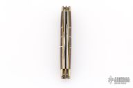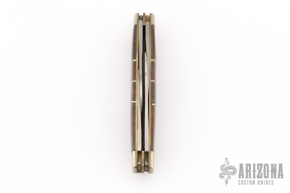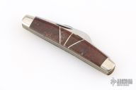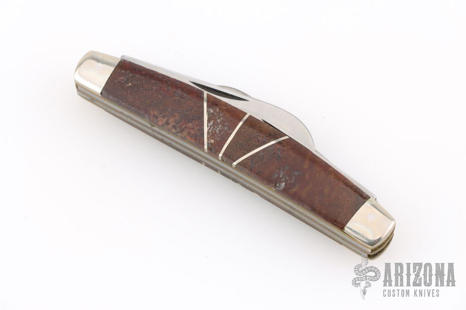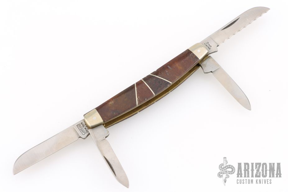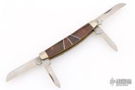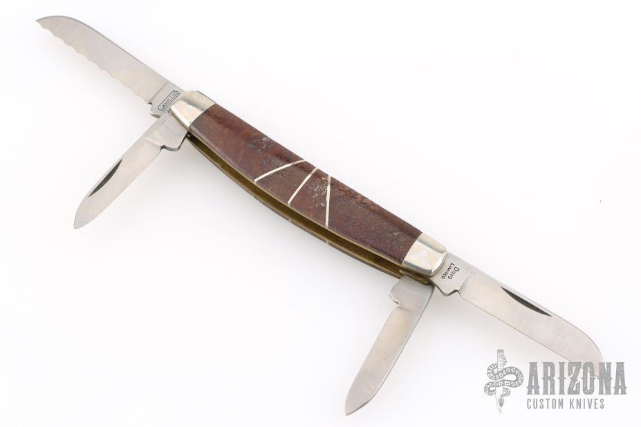 This slipjoint by Camillus Knives was customized by Santa Fe Stoneworks. It features a satin finished blades with nail nicks. The handle has nickel silver bolsters, stone inlays, stainless spacers, brass liners, stainless steel backspacer. Has a few light scratches, otherwise excellent condition.