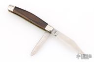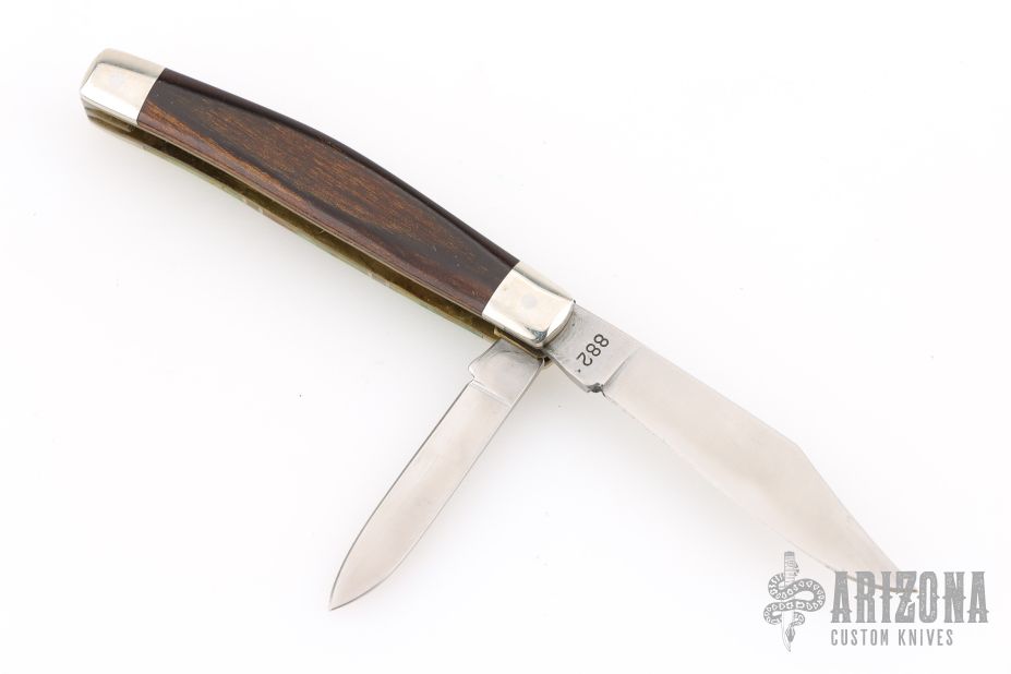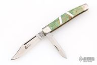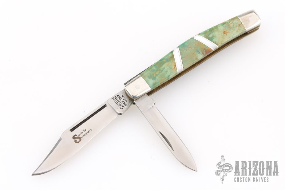 This slipjoint by Camillus Knives was customized by Santa Fe Stoneworks. It features a satin finished blades with nail nicks. The handle has nickel silver bolsters, stone inlays, stainless spacers, pearl spacers, brass liners, stainless steel backspacer. Has a few light scratches, otherwise excellent condition.