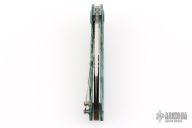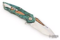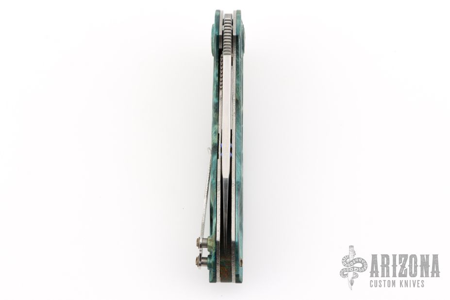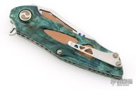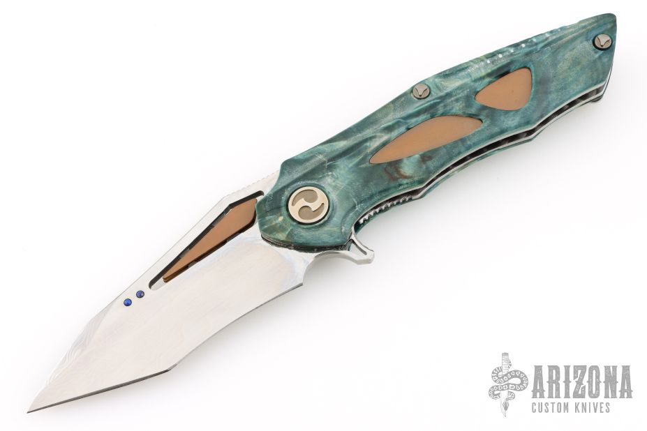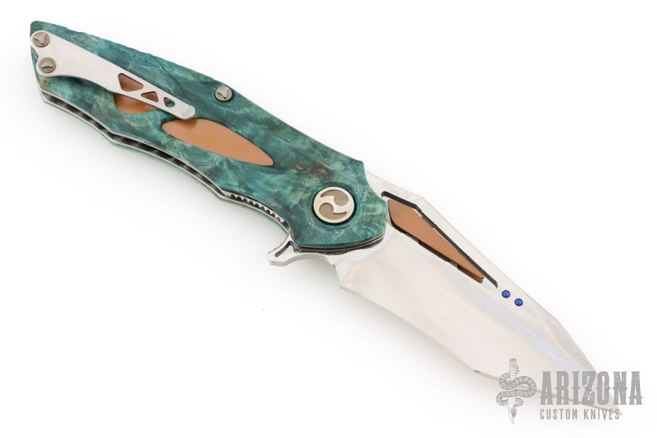 This Noah Flipper from Dew Hara features a VG-10 Core San Mai Damascus blade with copper inserts and lapis ball inlays, notched thumbrest and flipper. The handle has stabilized poplar scales with copper inlays, textured stainless steel liners and a an antiqued copper backspacer. Skeletonized stainless steel tip up clip is positioned for right hand carry. Includes velcro cloth pouch. Nice detent and lockup, rides on bearings. Excellent condition. Marked 1 of 1 on the clip.