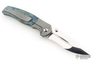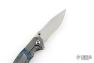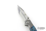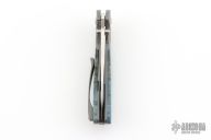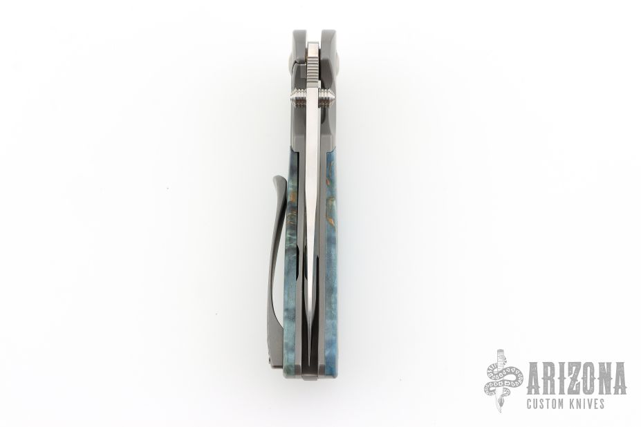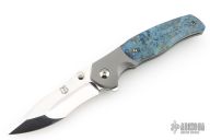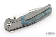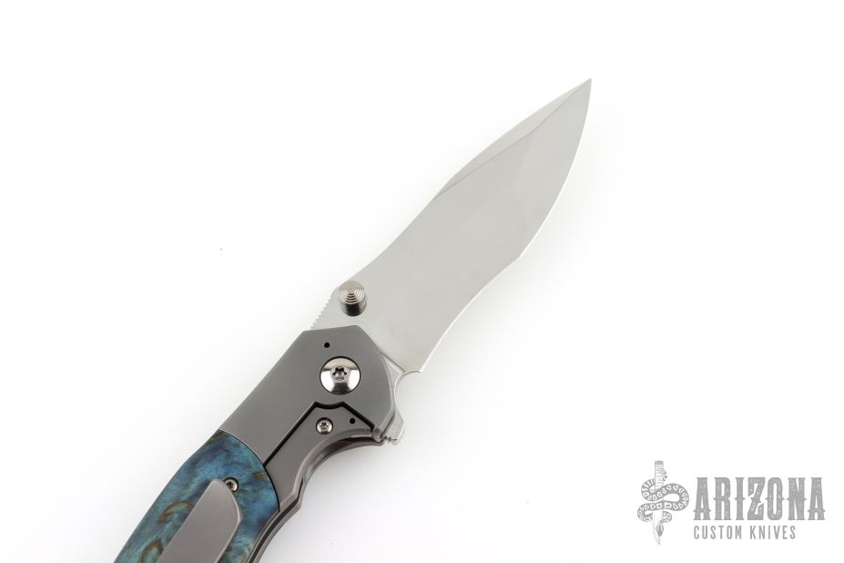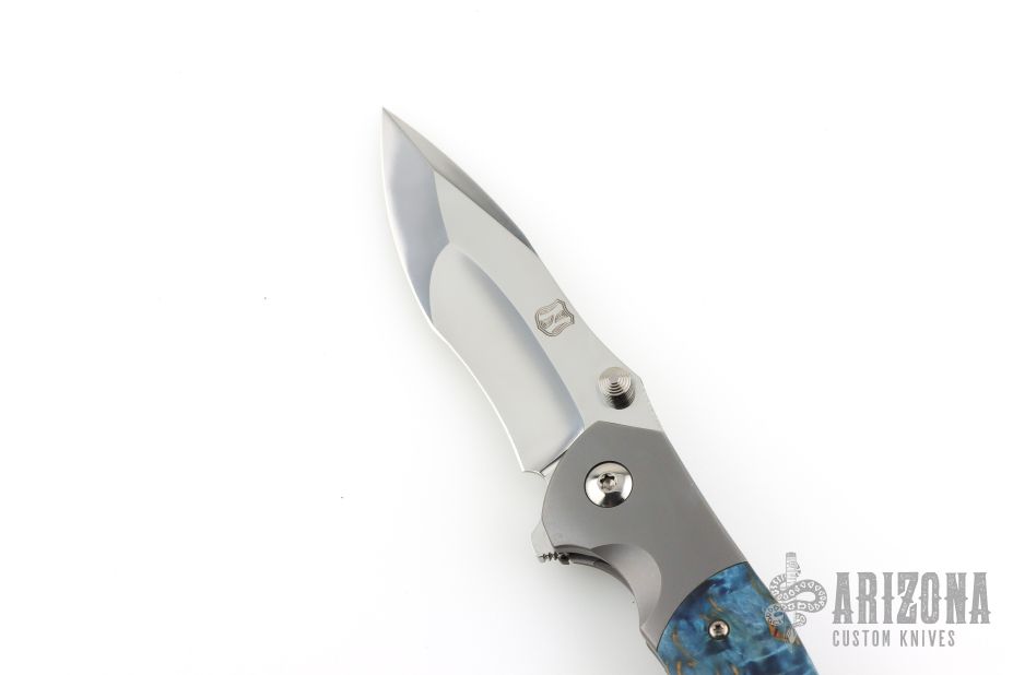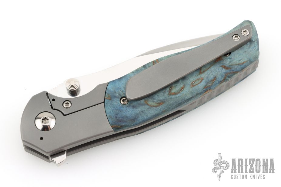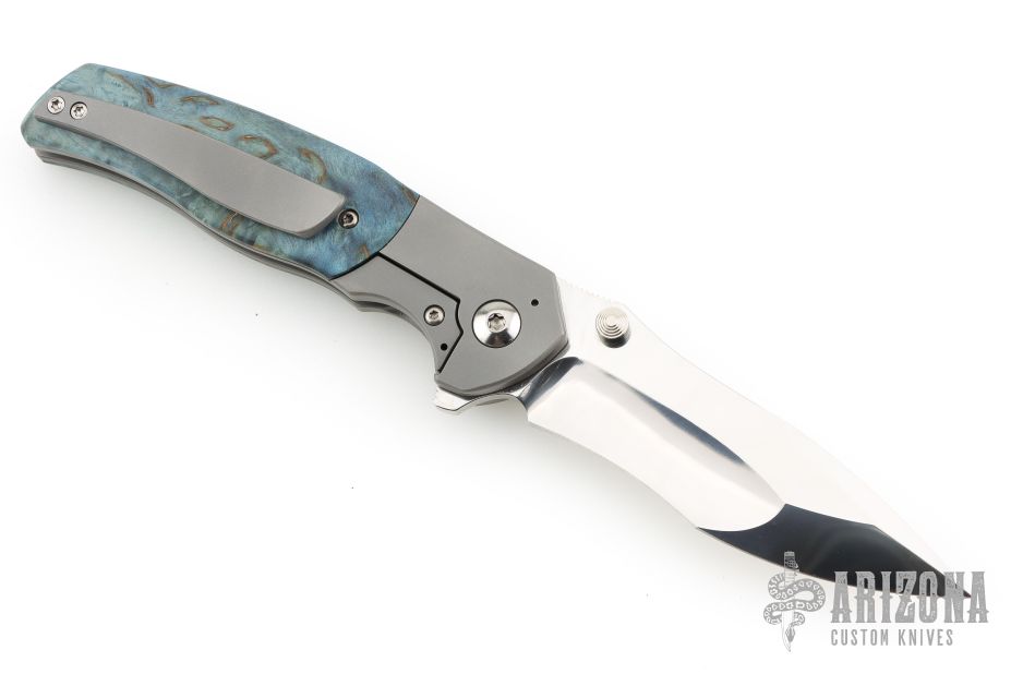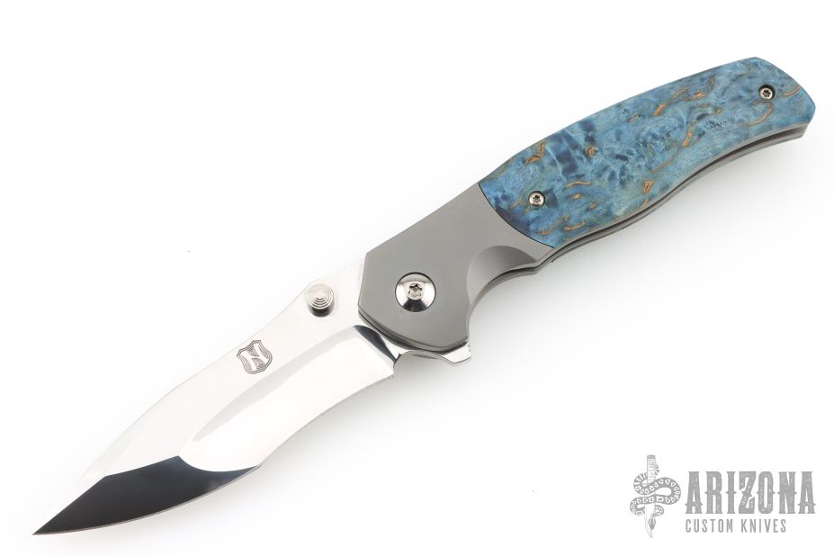 This Custom Pulse Bolsterlock Flipper by Nath Custom features a mirror polished blade with dual thumbstuds, notched thumbrest and flipper. The handle has a bead blasted titanium frame with blue maple burl scales, notched titanium backspacer and tip up clip. Rides on bearings, nice detent, lockup and blade seating. Comes with a zippered case and COA dated 6-25-25. Excellent condition.