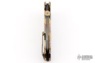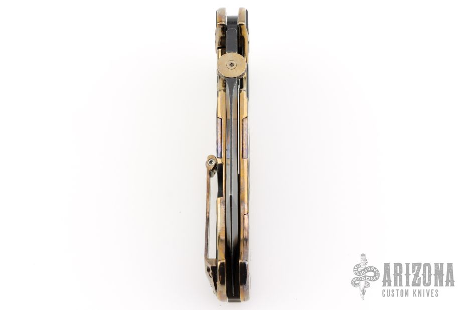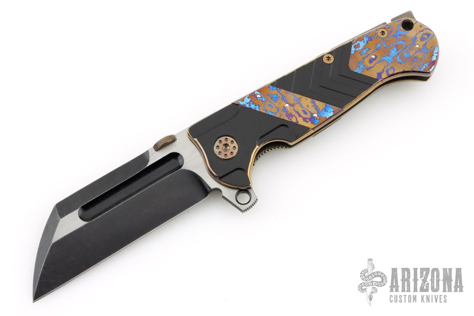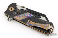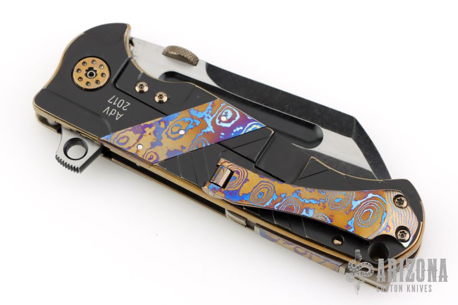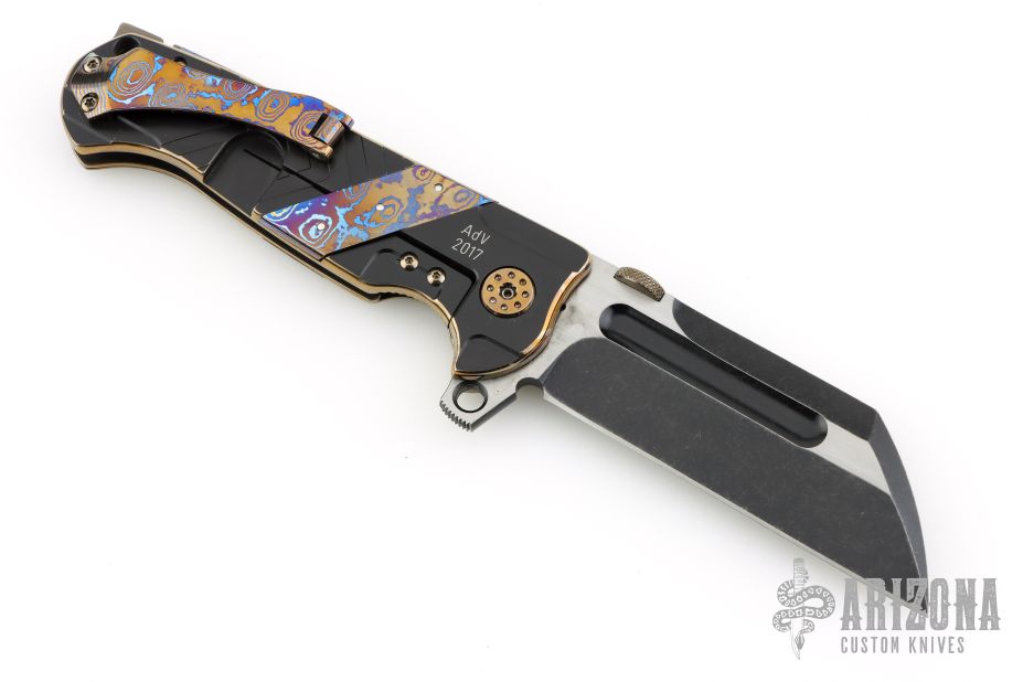 This ADV Butcher framelock flipper has a black tumble finished blade with fullers, notched flipper and a thumbdisc. The handle has a black coated titanium frame with bronze anodized edges, mokuti inlays  and tip up clip with mokuti roller, two-tone titanium backspace with mokuti inlay. Frame has V-milling for added grip and visual appeal. Has stainless steel lockbar insert. Nice smooth action, detent, lockup and blade seating. Comes with a zippered case. Excellent condition. Dated 2017