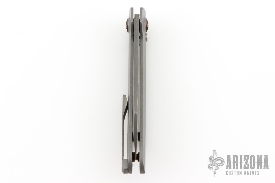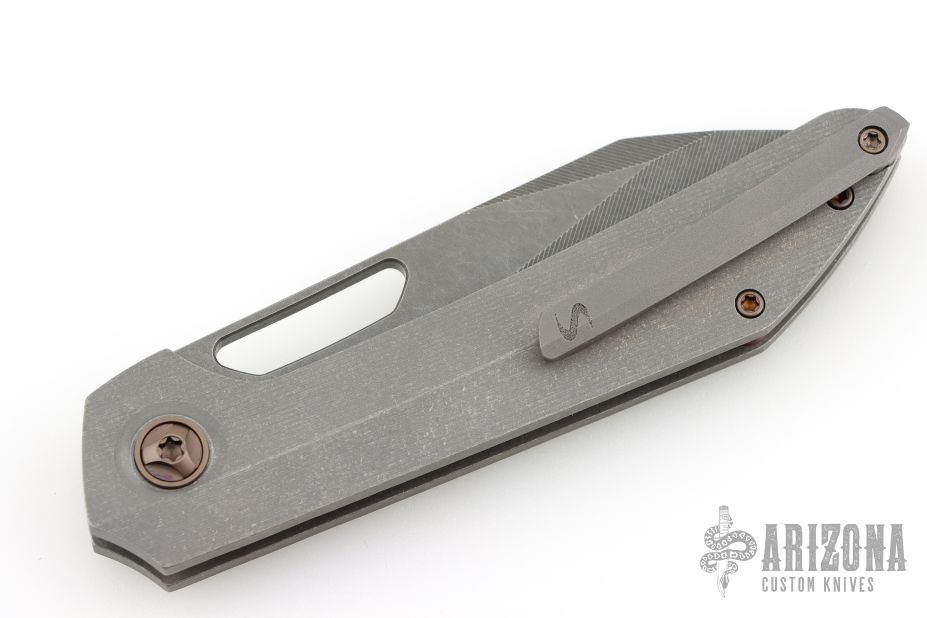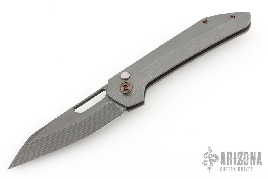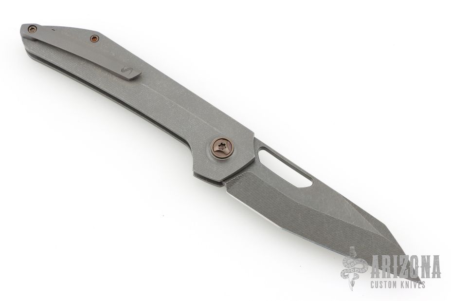This Aëtos Buttonlock from Simeon Custom Knives has a tumble finished blade with milled bevels and a thumbhole. The handle has a milled and tumbled titanium frame and tip up clip, anodized titanium hardware and pivot. Comes with a cloth case. Rides on bearings, nice detent, lockup and blade seating. Excellent condition.
