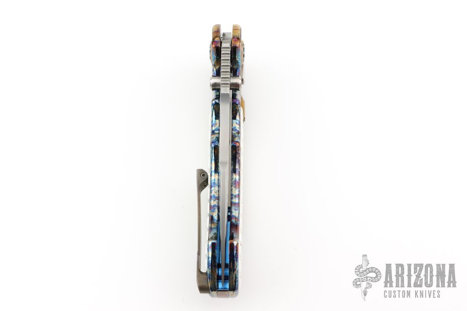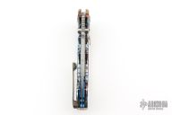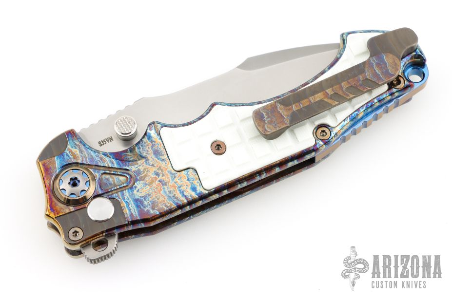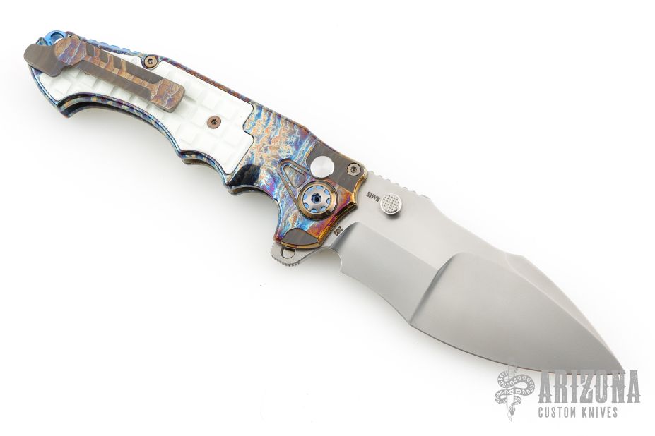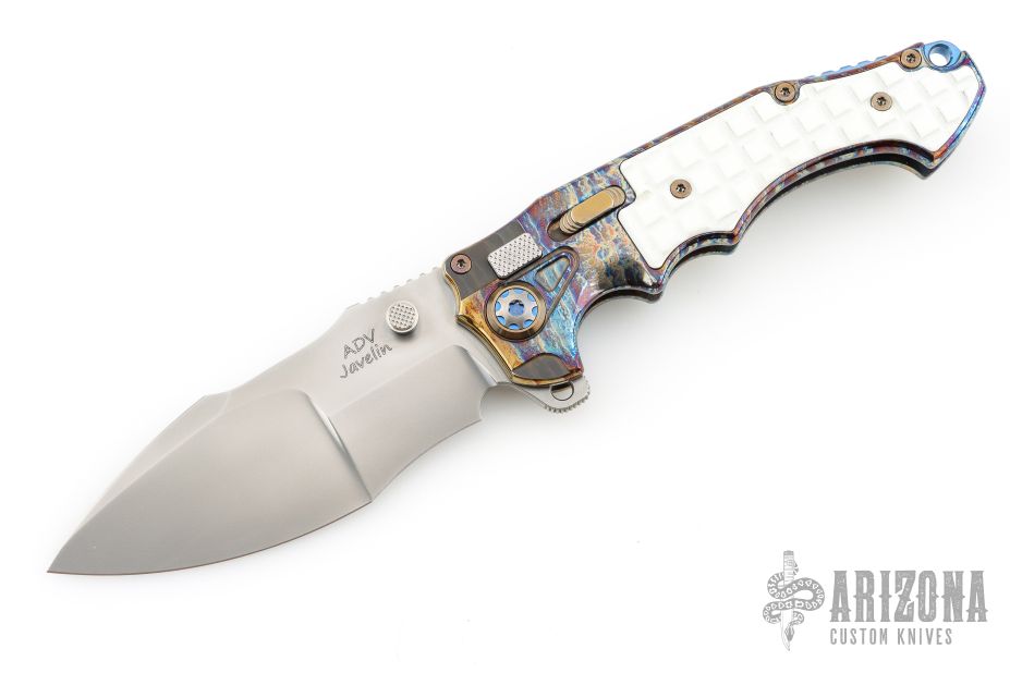 The Javelin folding knife from Andre de Villiers is a masterwork combining functionality and personality. This one has a bead blast finished blade with thumbhole, notched thumbrest and flipper. It swings smoothly on a ball-bearing system and has both a thumb hole and flipper opener; it can also be opened or closed with a flick of the wrist when the button lock is held down. It has a milled and anodized titanium handle with frag white G-10 inlays that offers an extremely comfortable grip. A jimped, black titanium backstrap with a lanyard hole and a tip-up titanium pocket clip with hidden screws. Comes with a zippered case. "2022" on the ricasso. Excellent condition.