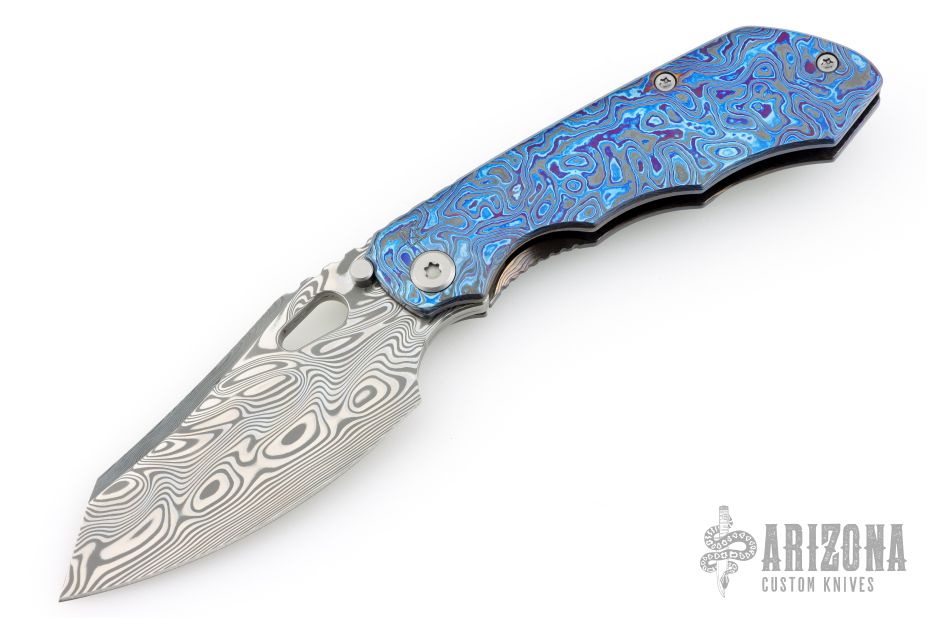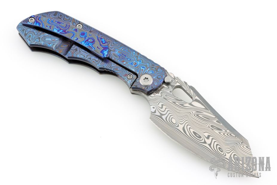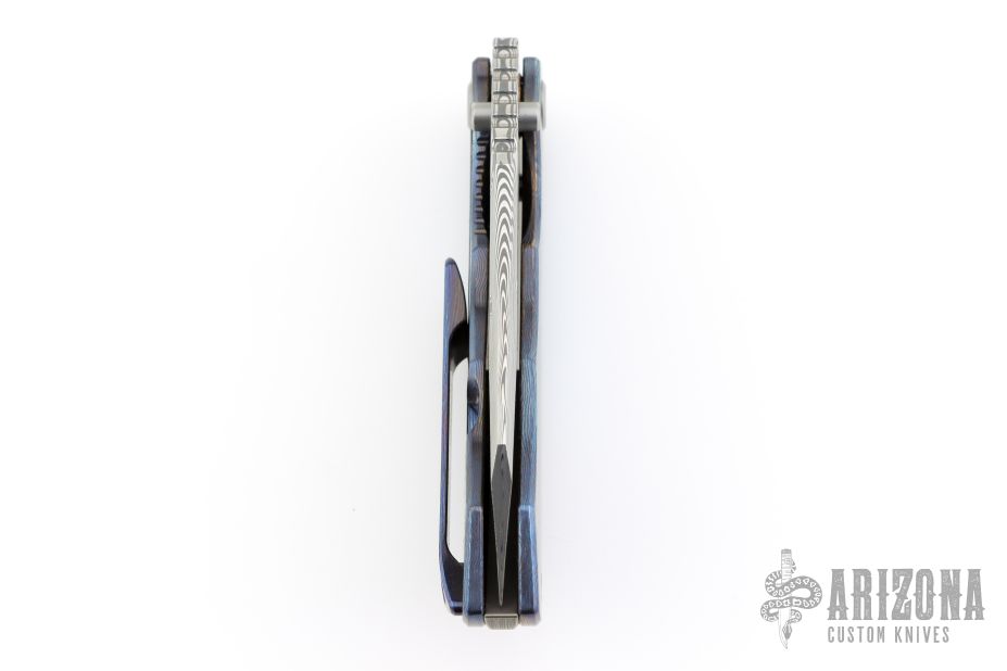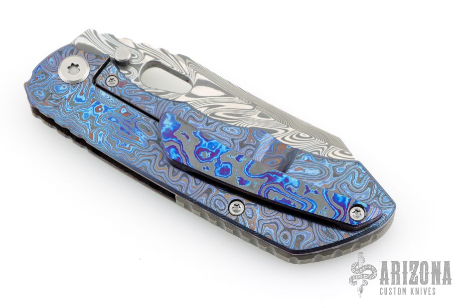 This EVO 1.1 by Custom Knife Factory features a Damasteel blade with notched thumbrest and thumbhole. The handle has a ZircuTi scale, black bark finished titanium frame with a tip up ZircuTi clip and notched backspacer. Comes with original case, extra hardware, cloth, and COA. Nice detent, lockup and blade seating. #72 and dated 9-25. Excellent Condition.