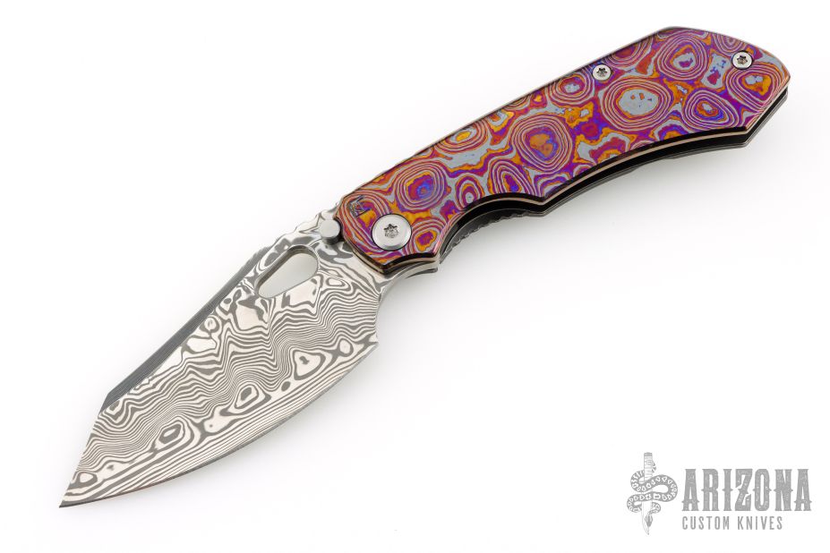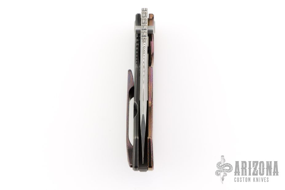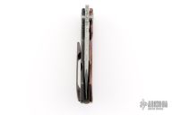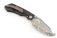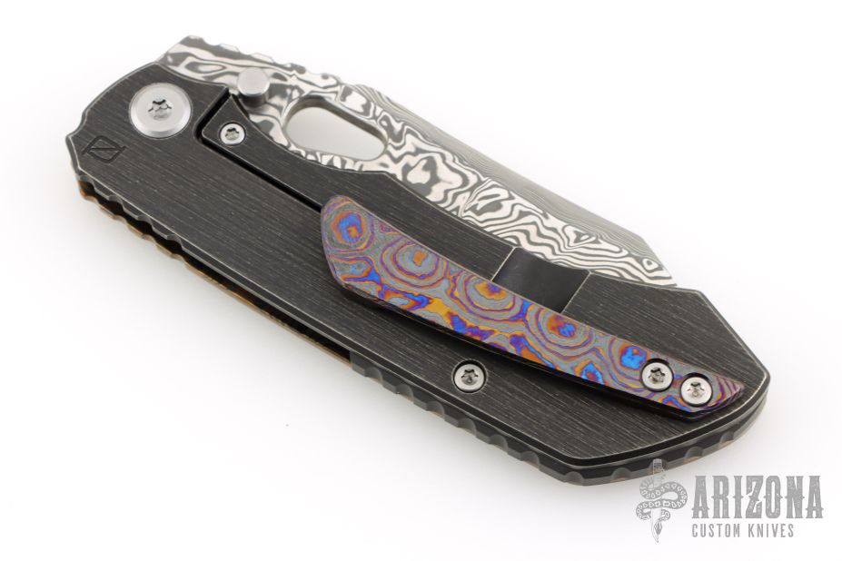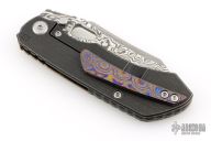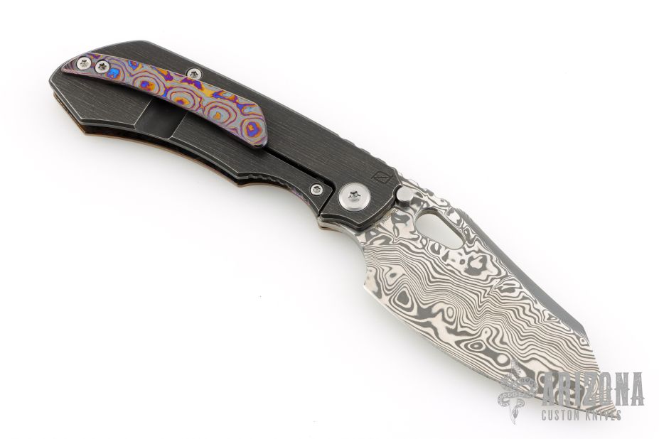 This Evolution 3.0 by Custom Knife Factory features a Damasteel blade with notched thumbrest and thumbhole. The handle has a ZircuTi scale, black bark finished titanium frame with a tip up ZircuTi clip and black backspacer. Comes with original case, cloth, and COA. Nice detent, lockup and blade seating. #68 and dated 9-22. Excellent Condition.
