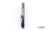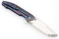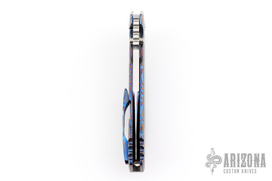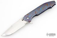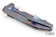 This Satori Integral by Peter Rassenti features a hand rub satin finished blade with notched thumbrest, dual satin thumbstuds and flipper. The handle is comprised of a textured integral Timascus and a lanyard hole in pommel. The matching pocket clip is positioned for right hand, tip up carry. Includes a zippered case. Has a couple light scuffs/scratches, otherwise excellent condition.
