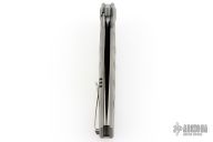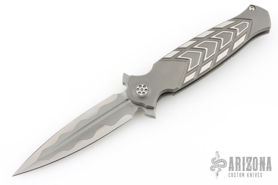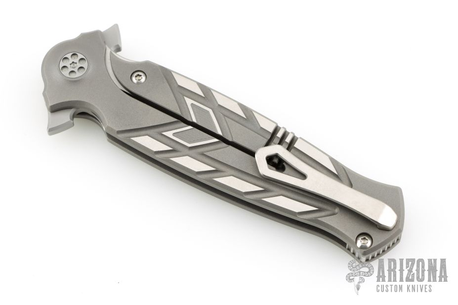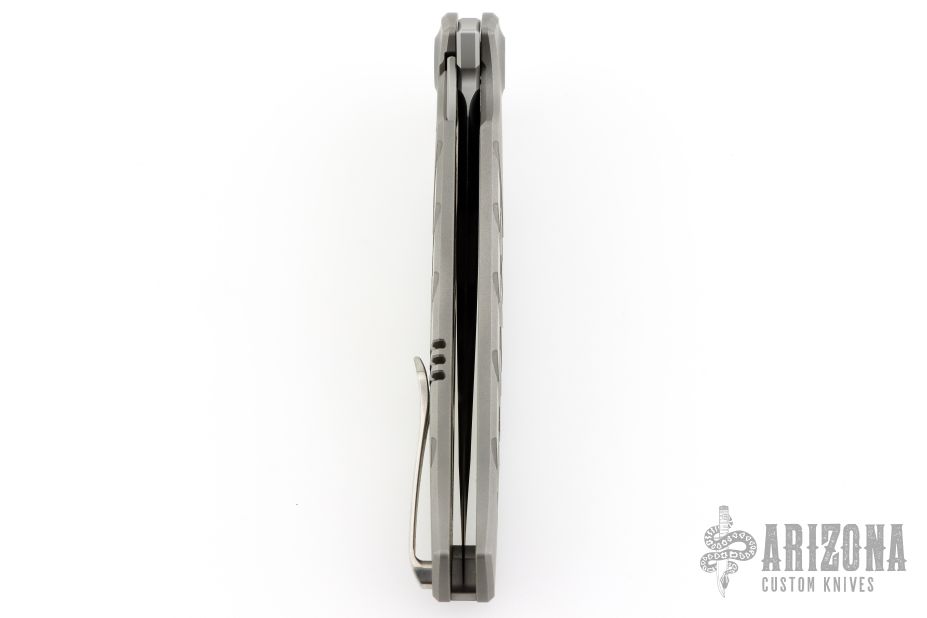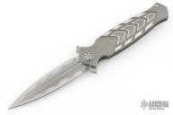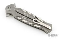 This Arch Nemesis by Brian Nadeau features a double-edged and intricately milled blade with flipper. The handle has a blasted and "tread" milled titanium frame and tip up titanium clip with hidden screws. Rides on bearings, nice detent, lockup and blade seating. Comes with maker's zipper case, and metal COA. Excellent condition.