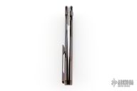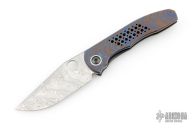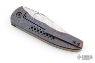This Large Nirvana folder by Peter Rassenti features a polished Damasteel clip point blade with thumbhole and notched thumbrest. The handle has an integral Mokuti frame with a matching tip up clip, Damasteel pivot collar. Nice detent, lockup and blade seating. Comes with original box. Excellent condition.