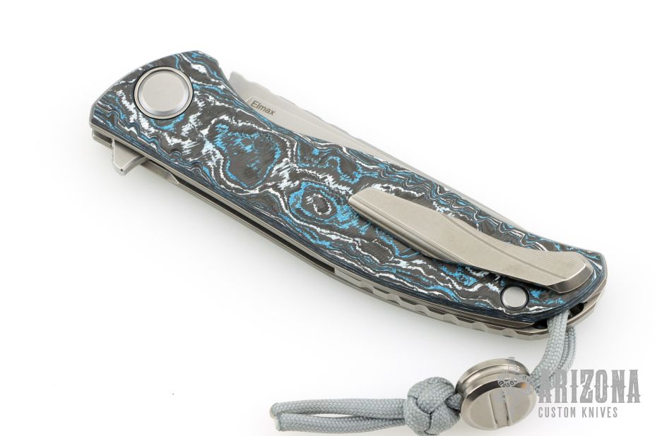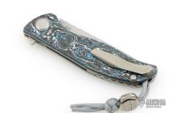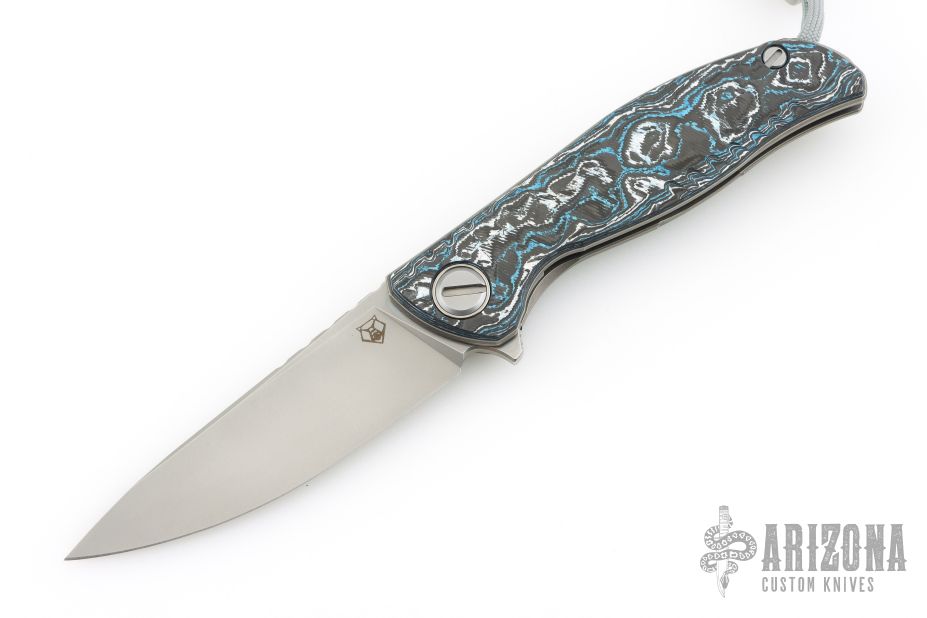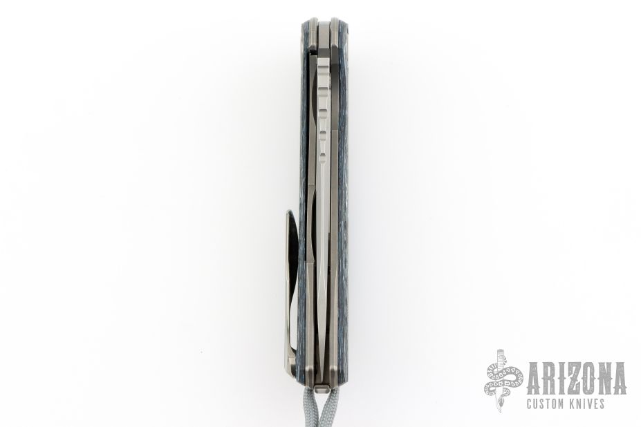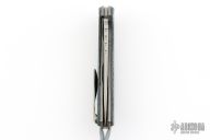 This F3 Flipper from Shirogorov has a tumbled flat ground spear point blade with notched flipper. Handle has Northern Wind Techno carbon fiber scales, tumbled titanium backspacer, tip up clip and liners. Recessed lanyard bail. Dead center blade seating, excellent detent and lockup. Rides on bearings. Excellent condition. Comes with original box, bead, and papers.
