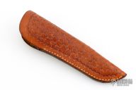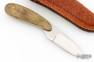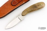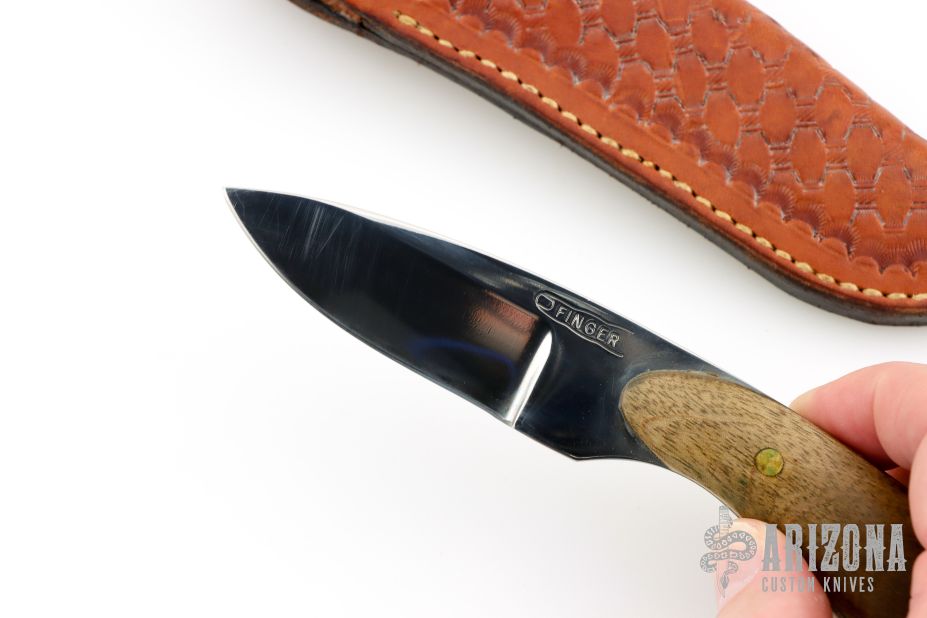 This knife by LC Finger features a polished blade with .186" blade stock and 1.111" blade depth, full tang construction. The handle has wood scales with brass pins. Comes with a hand tooled brown leather sheath. Has some light scratches, otherwise excellent condition for its age. It was purchased directly from the maker in 1985.