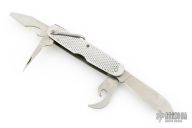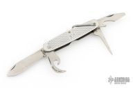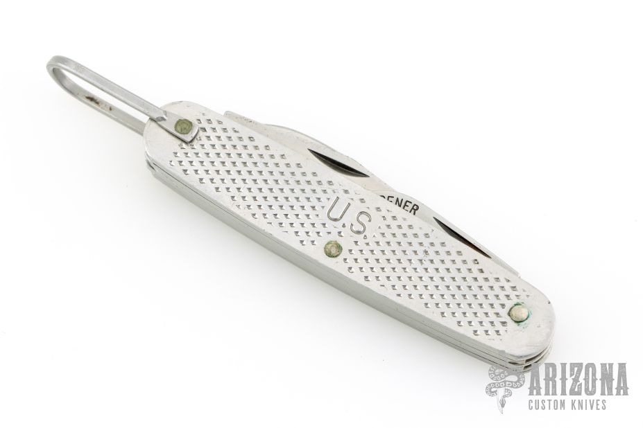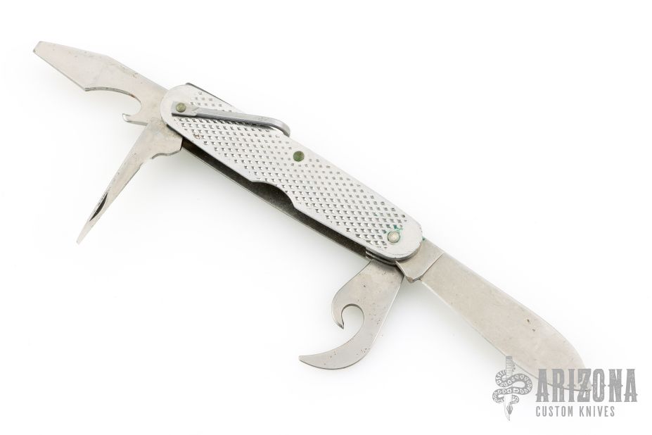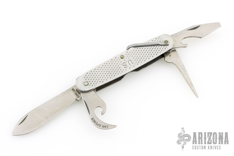 This folder by Camillus features a stonewash finished drop point blade with nail nick, and a folding awl as well. The handle has steel covers, steel liners, springs, shackle, can opener, and bottle opener. Has some scratches and patina, otherwise great condition.
