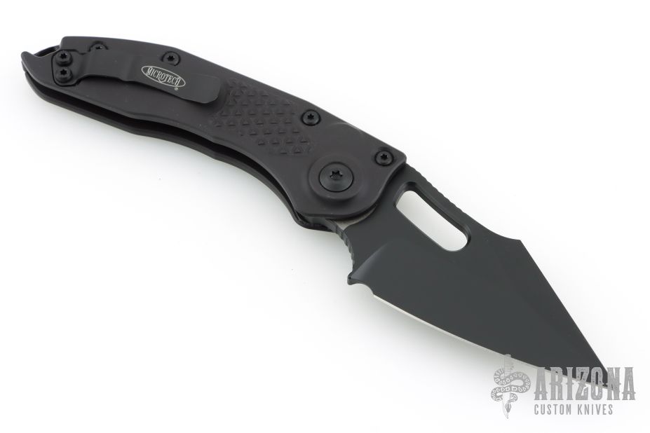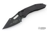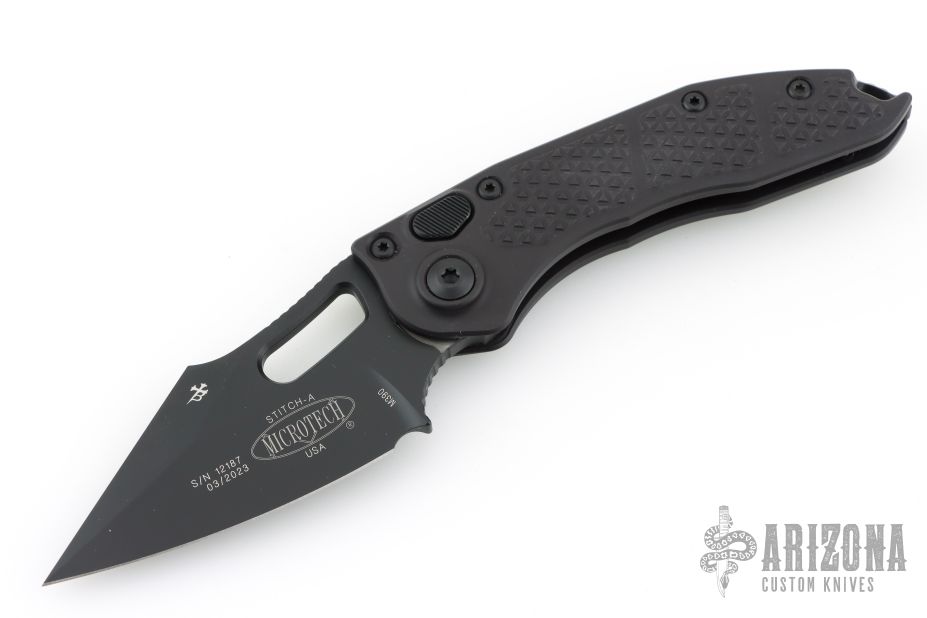 This Stitch Auto by Microtech Knives features a DLC finished blade and false top edge, notched thumb and finger rests. The handle has a black anodized and milled aluminum handle with a DLC titanium backspacer, DLC stainless steel hardware and clip, tip up carry, lanyard hole at the butt. Comes with original box and papers. S/N 12187 and dated 03/2023. Excellent condition.