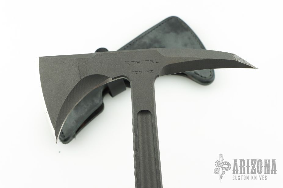 This Kestrel by RMJ features a tungsten cerakote blade with spike and fullers on the tang, .400" thick blade stock and tang. The handle has black G-10 scales. Comes with original box, papers and a CLW black leather sheath. Excellent condition.