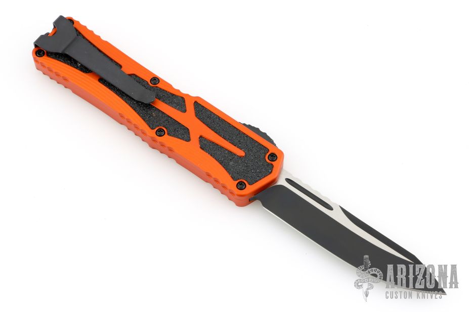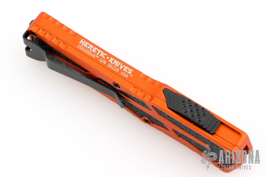 This Colossus by Heretic Knives features a two-tone blade with fullers, and notched thumbrest. The handle has an orange aluminum frame with non-slip inlays, checkered thumb slide, stainless steel tip down clip. Comes with original box. S/N 01119. Excellent condition.